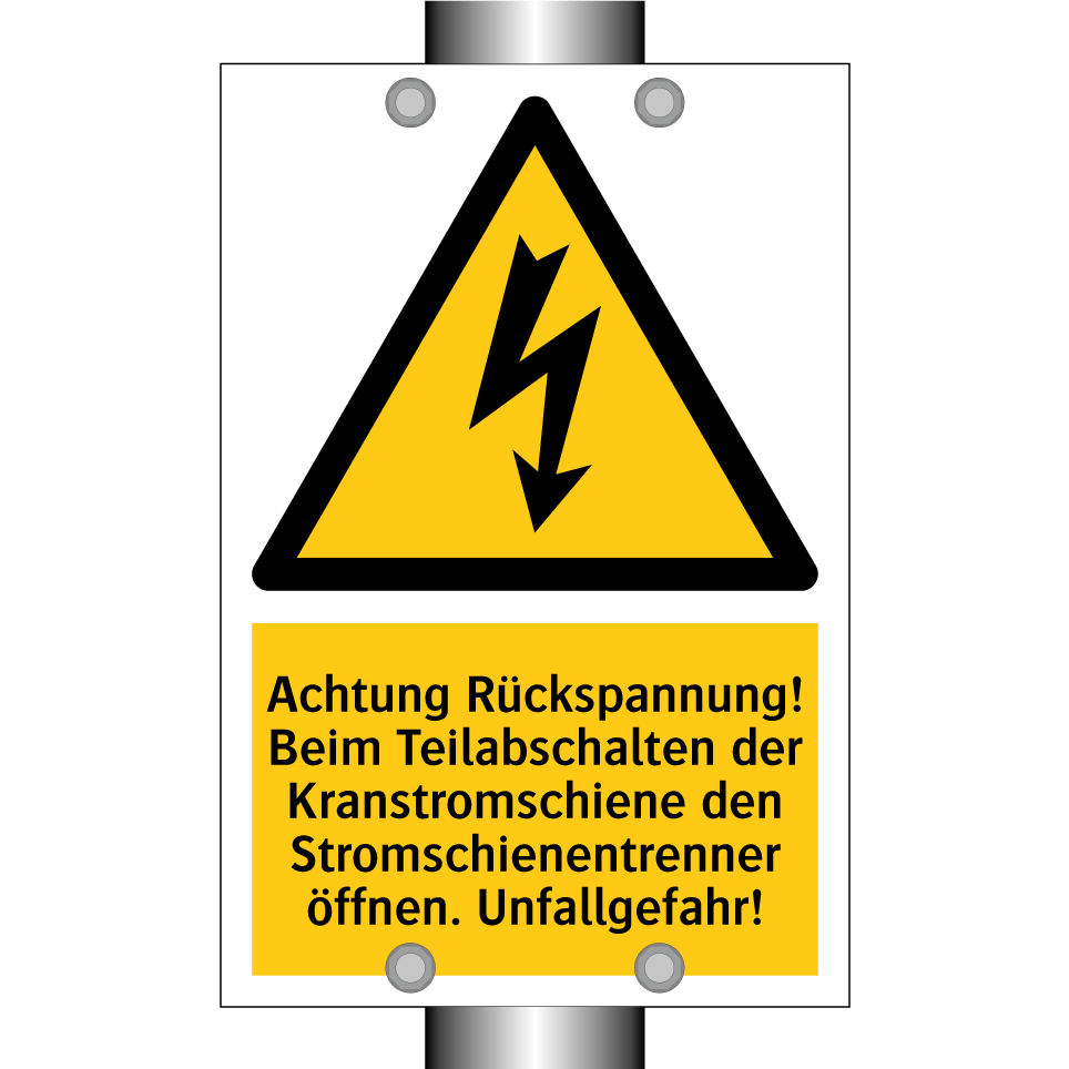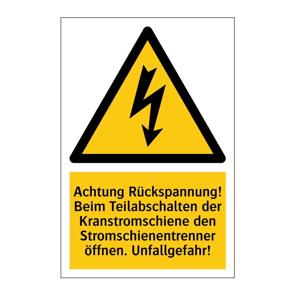 Warnschild mit dem Text Achtung Rückspannung! Beim Teilabschalten der Kranstromschiene den Stromschienentrenner öffnen. Unfallgefahr!