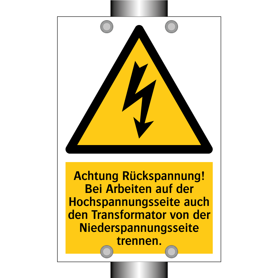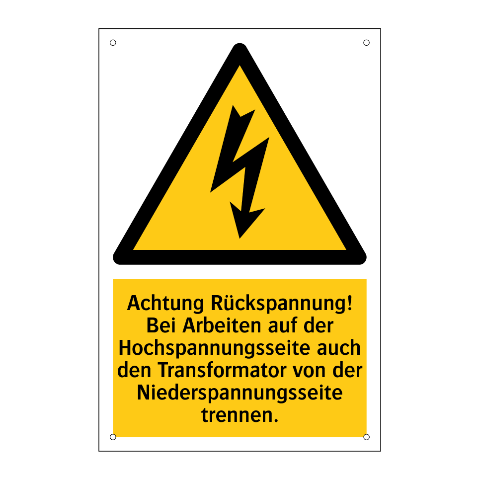 Warnschild mit dem Text Achtung Rückspannung! Bei Arbeiten auf der Hochspannungsseite auch den Transformator von der Niederspannungsseite trennen.