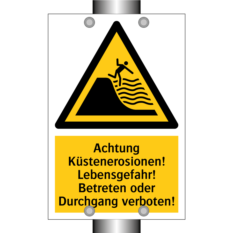 Diese auffällige Warnschild mit gelbem Hintergrund und schwarzer Schrift ist ideal, um auf die Gefahren von Küstenerosionen hinzuweisen. Sie eignet sich perfekt für den Einsatz in Küstengebieten, an Klippen oder in der Nähe von Stränden, wo die Gefahr von Erdrutschen oder instabilem Gelände besteht. Die klare Symbolik und der prägnante Text machen sie unverzichtbar für die Sicherheit von Besuchern und Passanten. Platzieren Sie diese Warnschilder an gut sichtbaren Stellen, um sicherzustellen, dass die Botschaft effektiv vermittelt wird und das Betreten gefährlicher Bereiche vermieden wird. Ideal für Gemeinden, Naturschutzgebiete und private Grundstücke in gefährdeten Regionen.