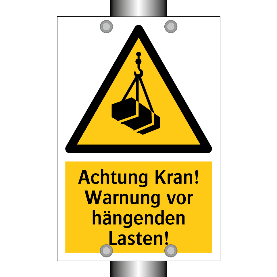 Warnschild mit dem Text Achtung Kran! Warnung vor hängenden Lasten!