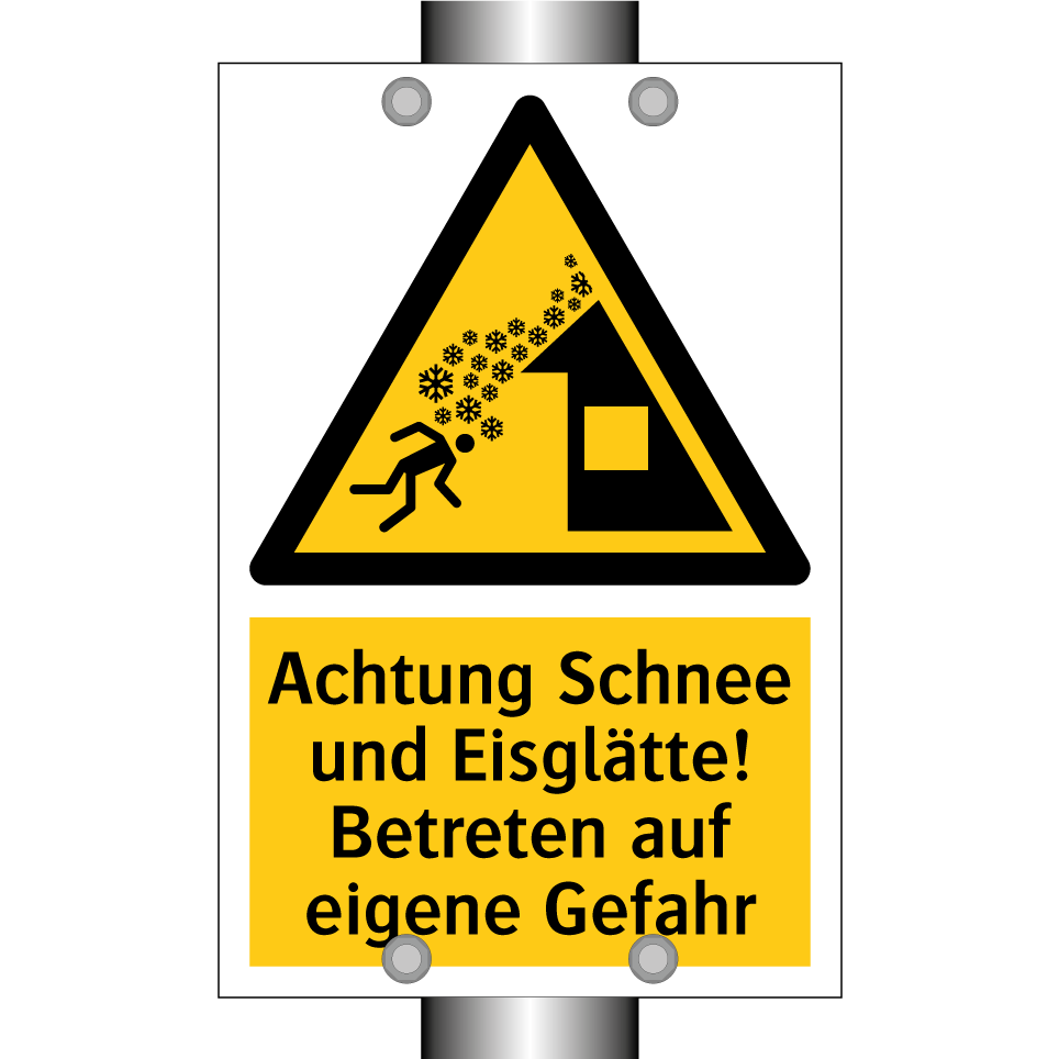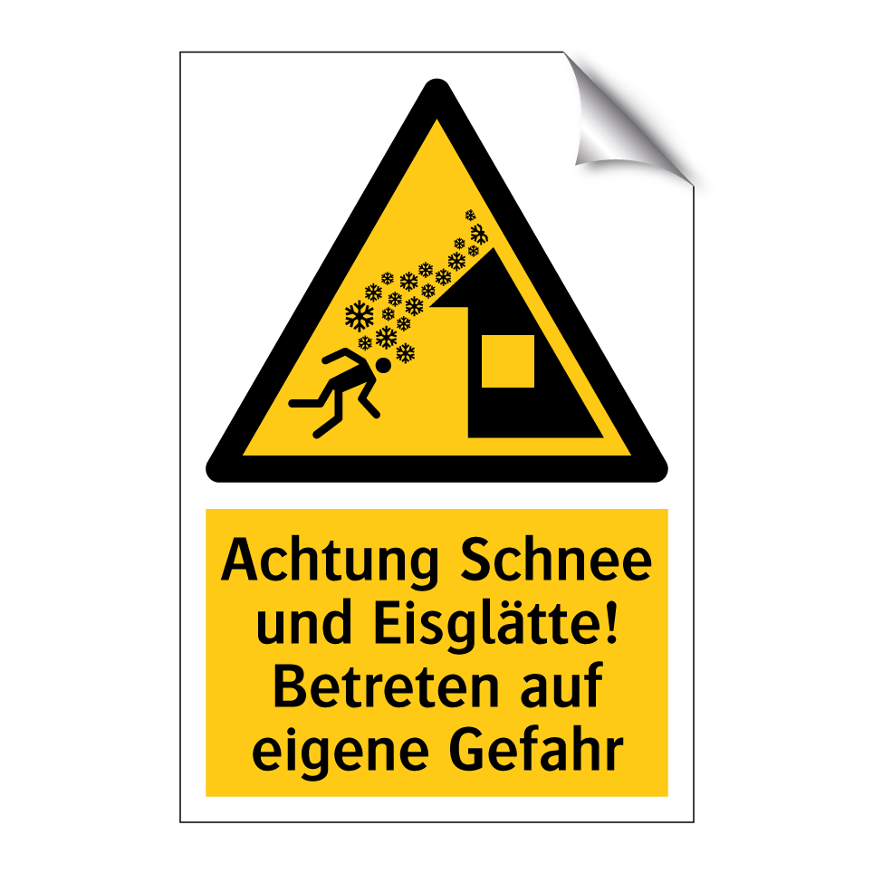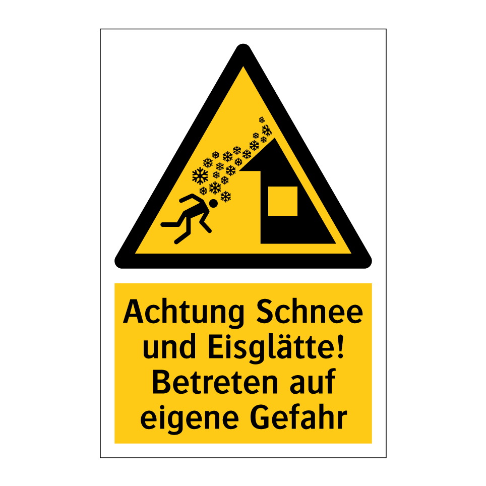 Warnschild mit dem Text Achtung Schnee und Eisglätte! Betreten auf eigene Gefahr