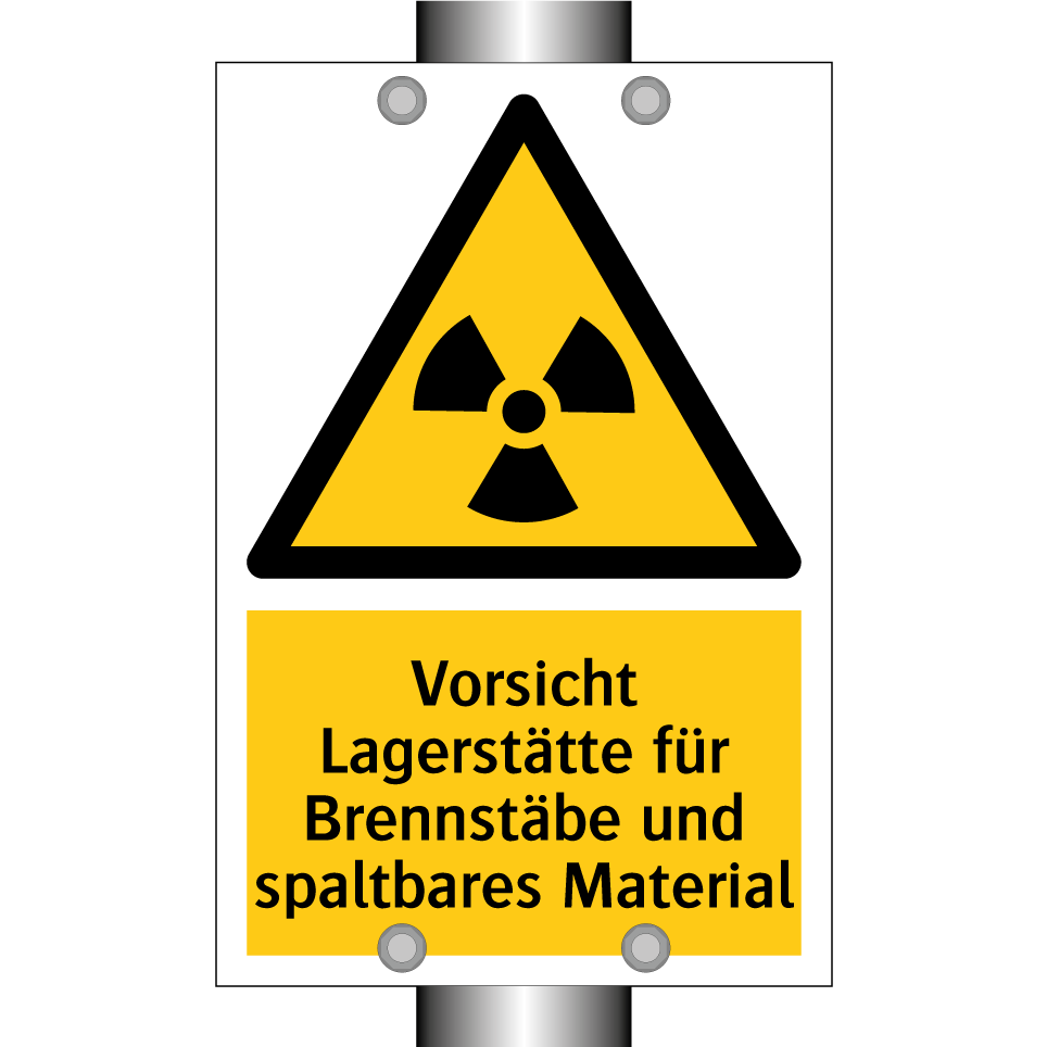 Warnschild mit dem Text Vorsicht Lagerstätte für Brennstäbe und spaltbares Material