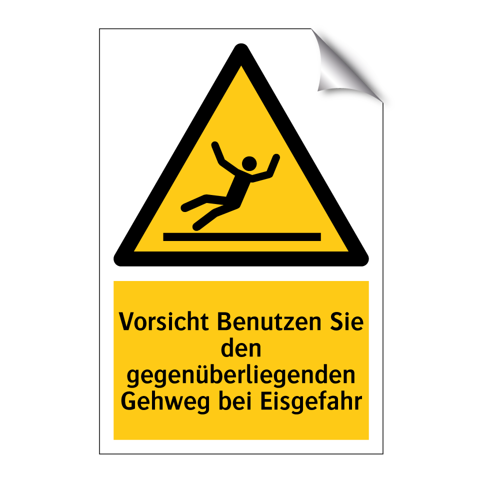 Warnschild mit dem Text Vorsicht Benutzen Sie den gegenüberliegenden Gehweg bei Eisgefahr