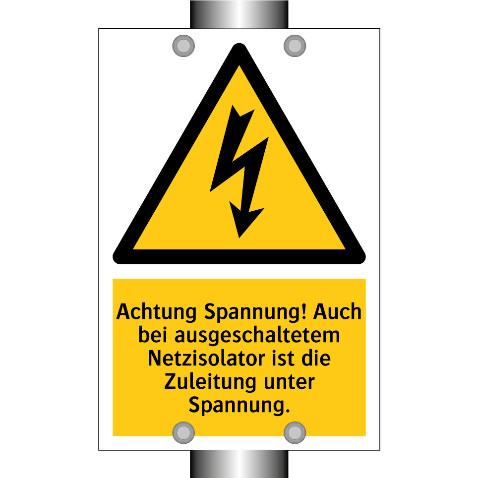 Warnschild mit dem Text Achtung Spannung! Auch bei ausgeschaltetem Netzisolator ist die Zuleitung unter Spannung.
