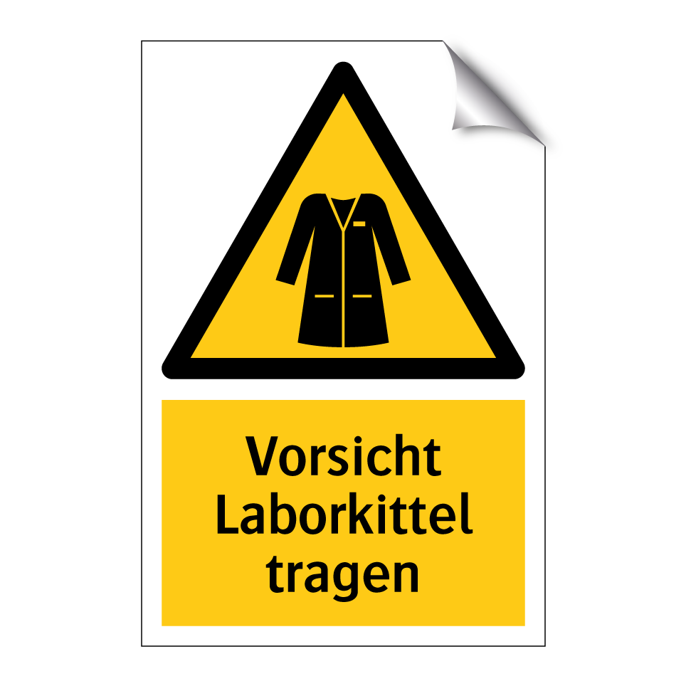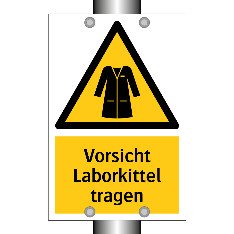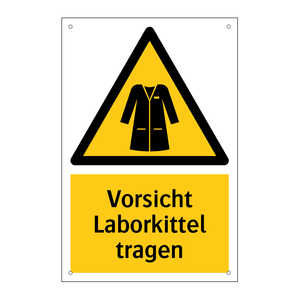 Warnschild mit dem Text Vorsicht Laborkittel tragen