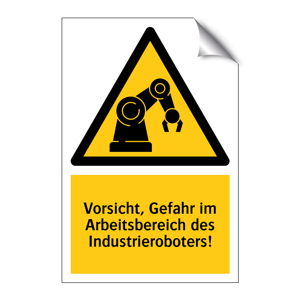 Warnschild mit dem Text Vorsicht, Gefahr im Arbeitsbereich des Industrieroboters!