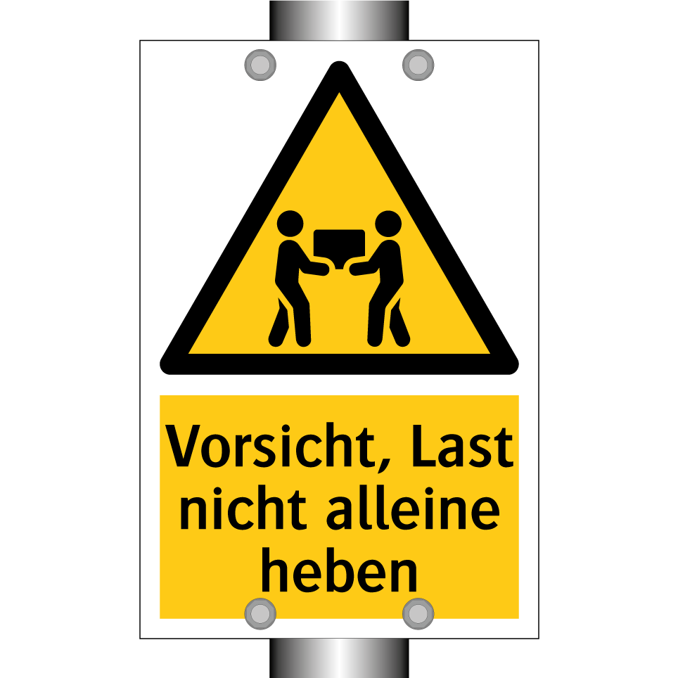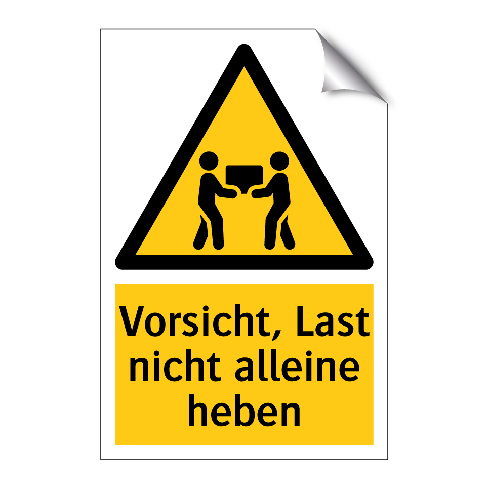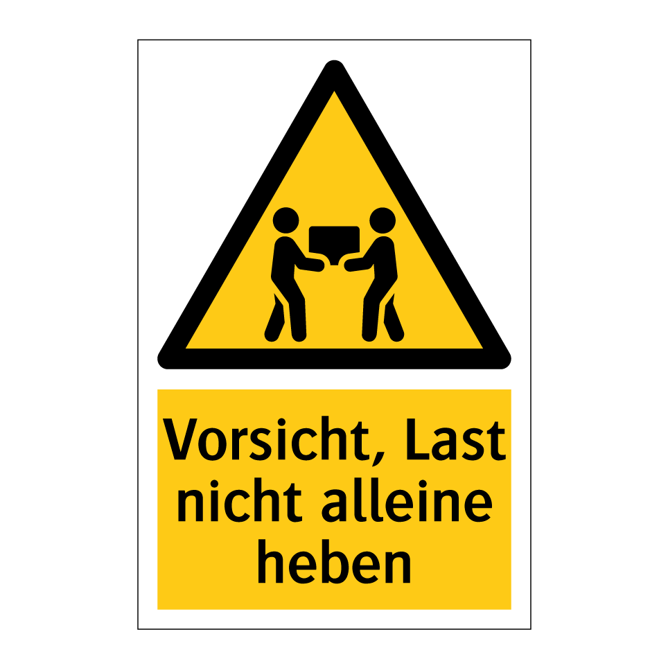 Warnschild mit dem Text Vorsicht, Last nicht alleine heben