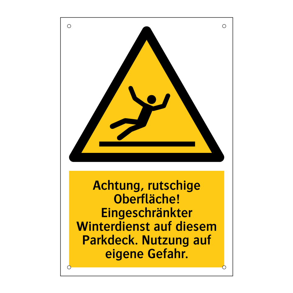 Warnschild mit dem Text Achtung, rutschige Oberfläche! Eingeschränkter Winterdienst auf diesem Parkdeck. Nutzung auf eigene Gefahr.