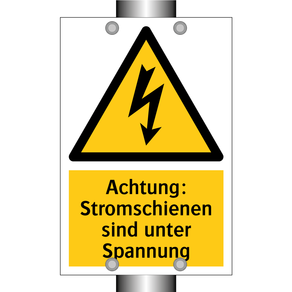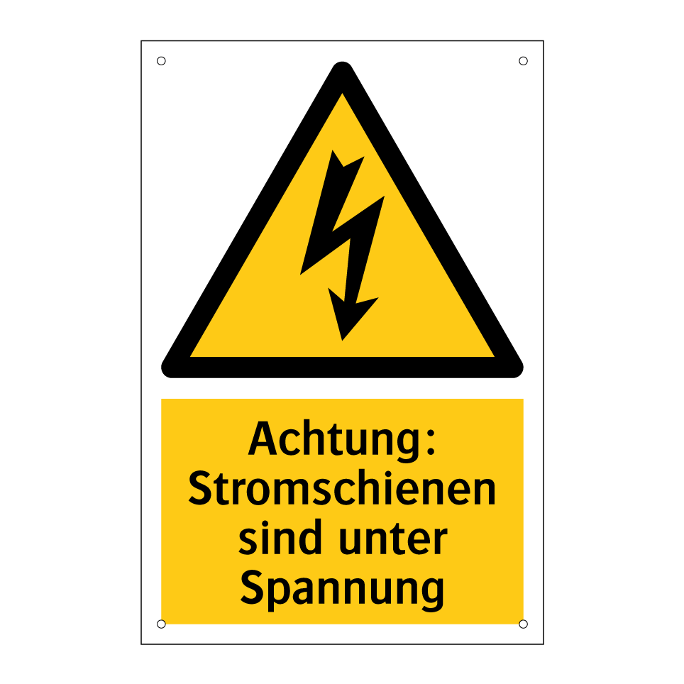Warnschild mit dem Text Achtung: Stromschienen sind unter Spannung
