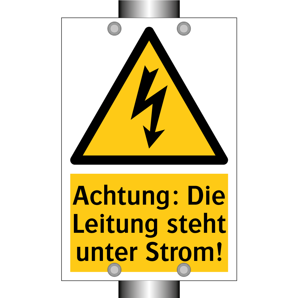 Warnschild mit dem Text Achtung: Die Leitung steht unter Strom!