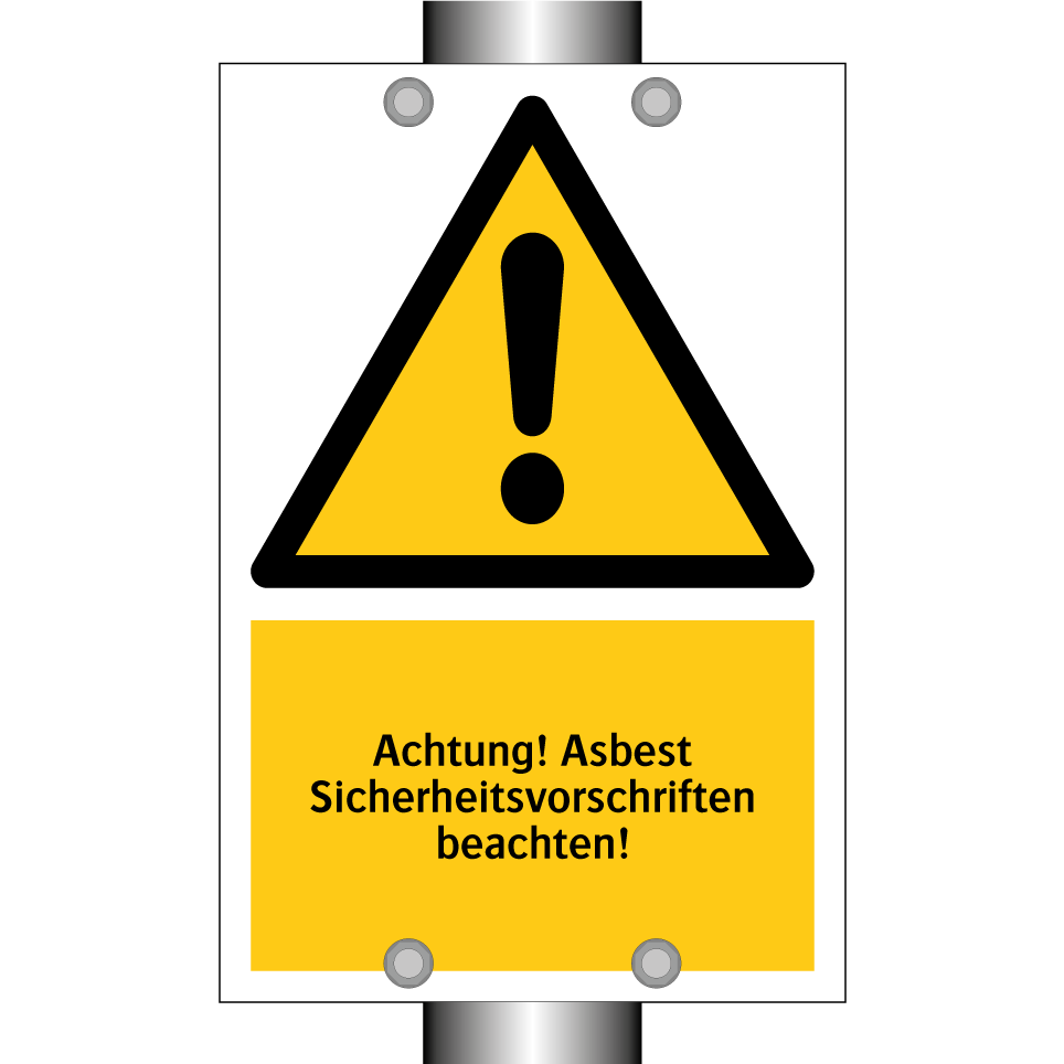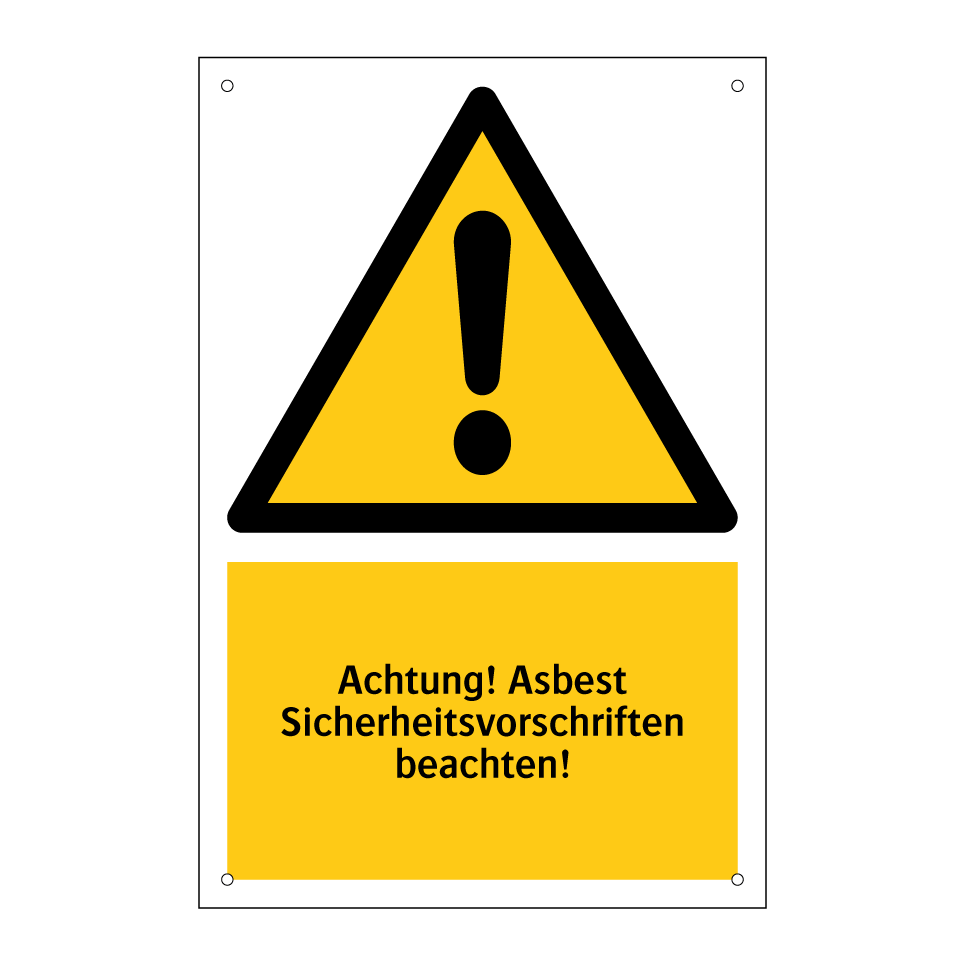Warnschild mit dem Text Achtung! Asbest Sicherheitsvorschriften beachten!