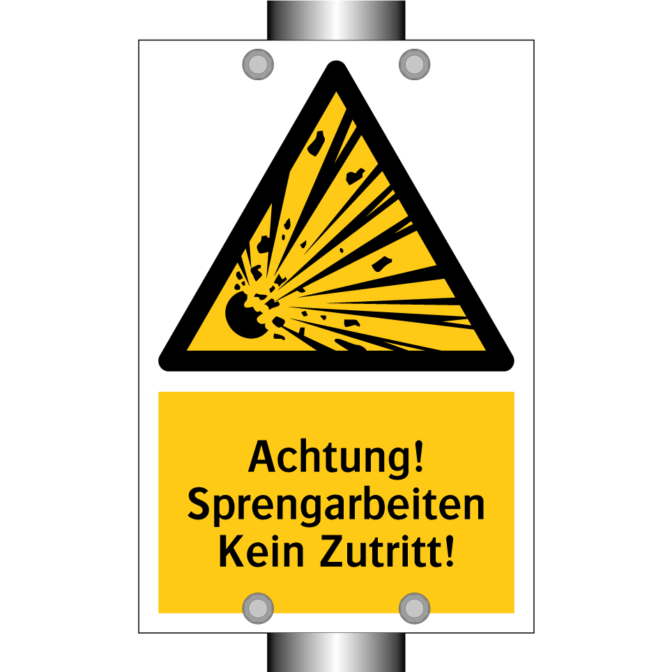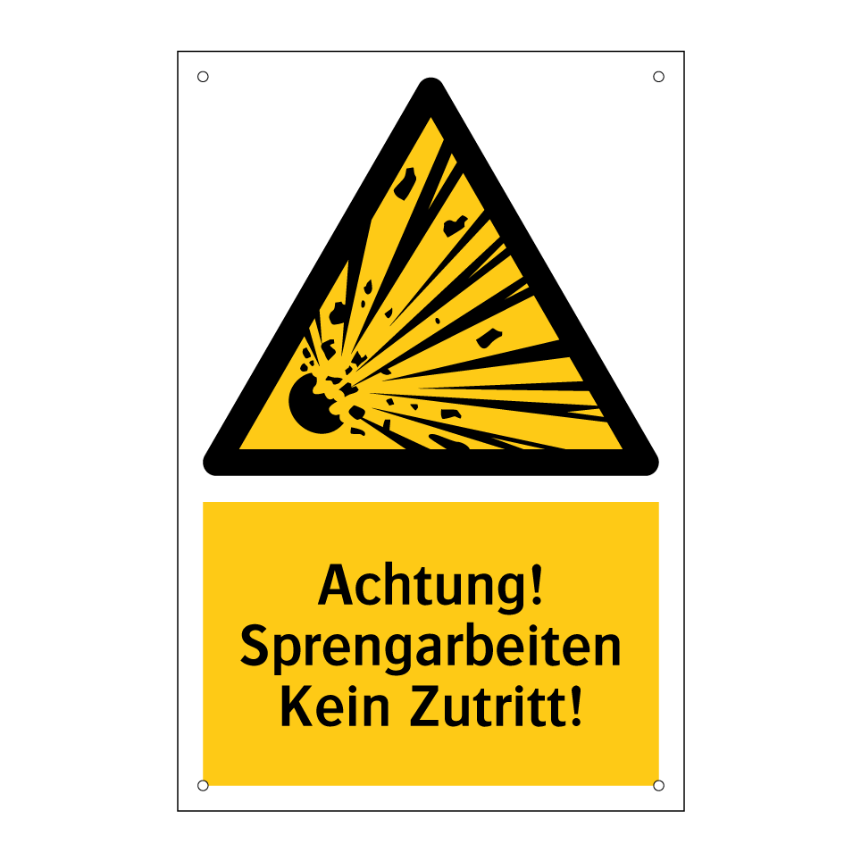 Warnschild mit dem Text Achtung! Sprengarbeiten Kein Zutritt!