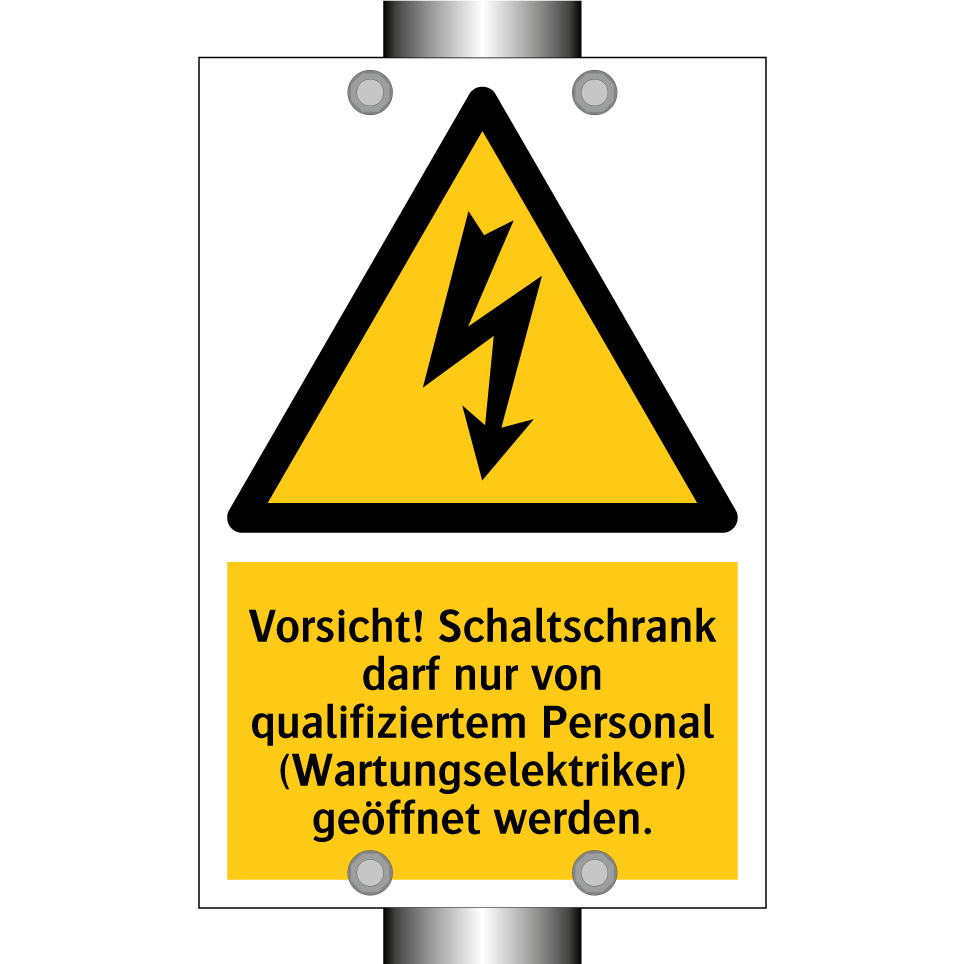 Warnschild mit dem Text Vorsicht! Schaltschrank darf nur von qualifiziertem Personal (Wartungselektriker) geöffnet werden.