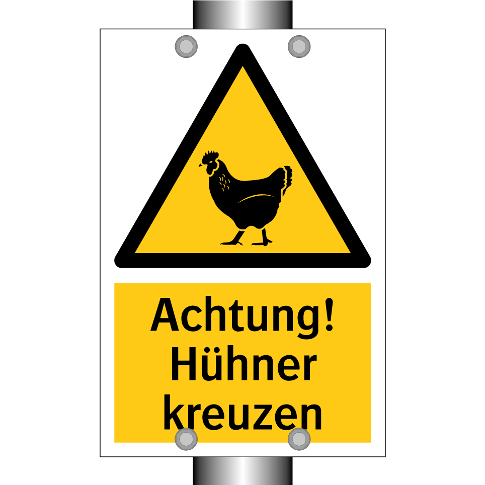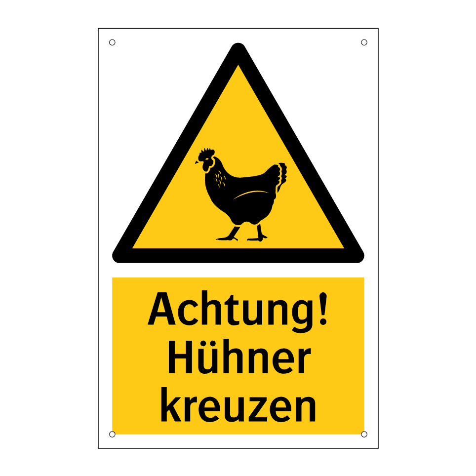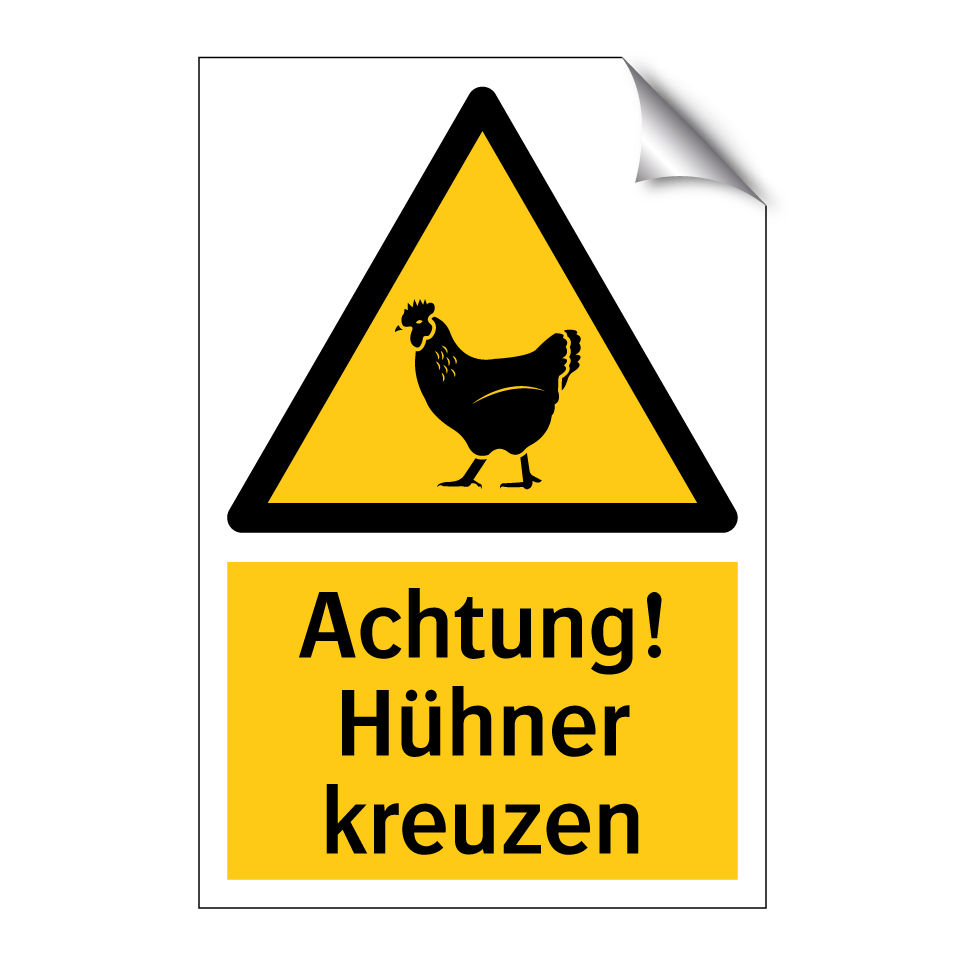 Warnschild mit dem Text Achtung! Hühner kreuzen