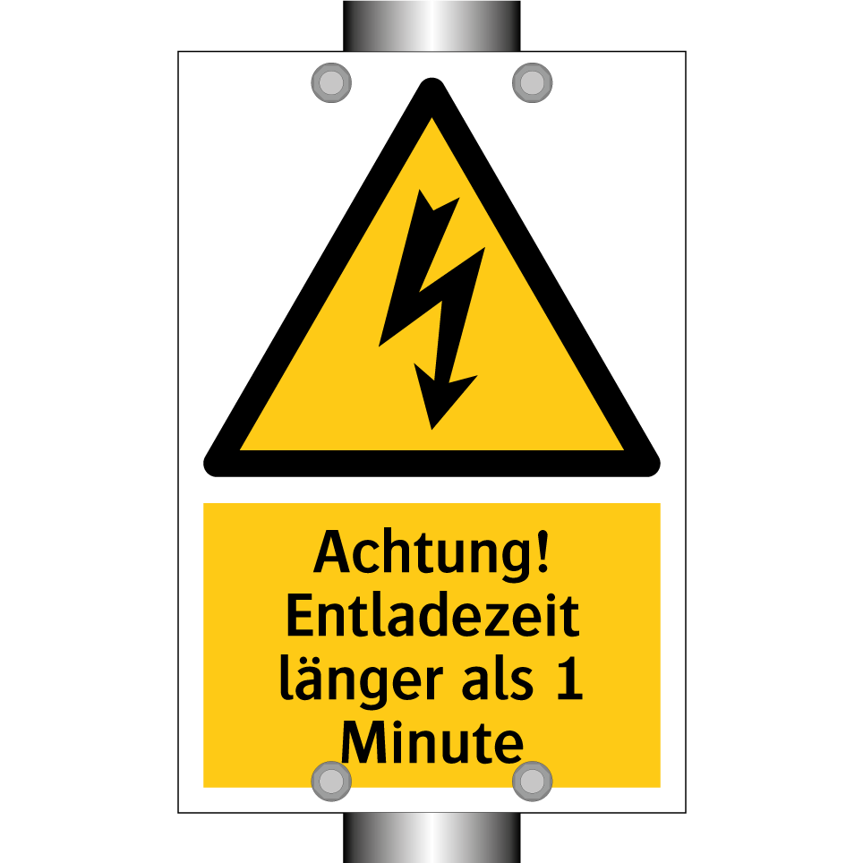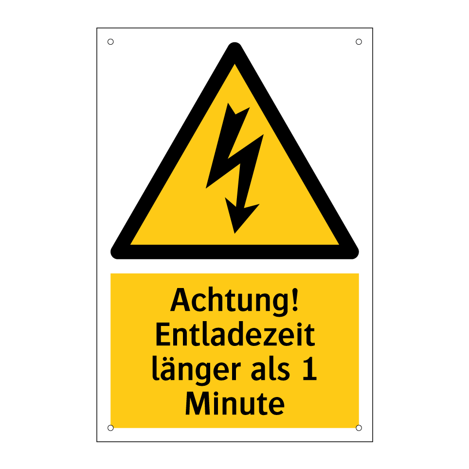 Warnschild mit dem Text Achtung! Entladezeit länger als 1 Minute