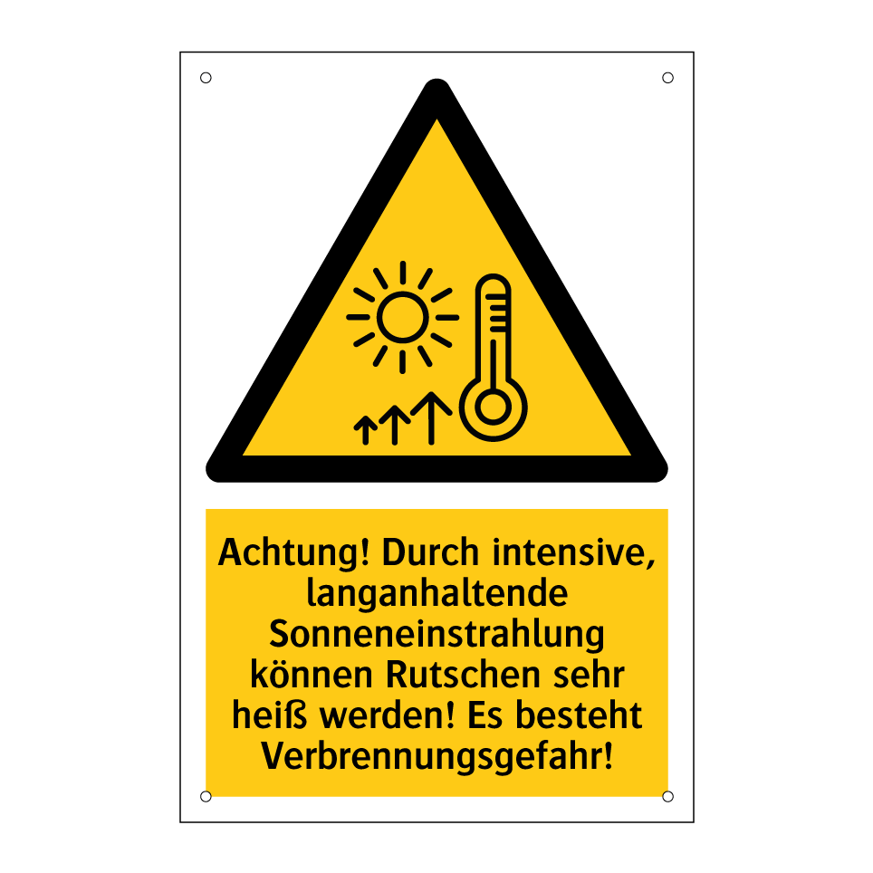 Warnschild mit dem Text Achtung! Durch intensive, langanhaltende Sonneneinstrahlung können Rutschen sehr heiß werden! Es besteht Verbrennungsgefahr!