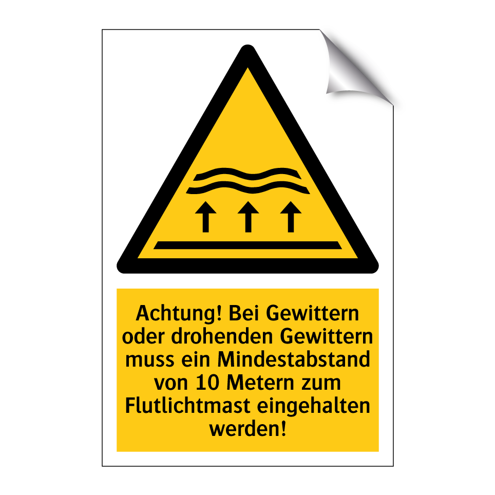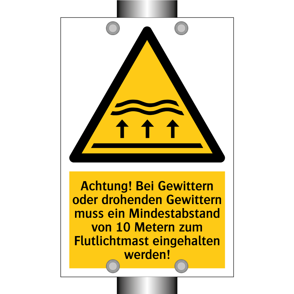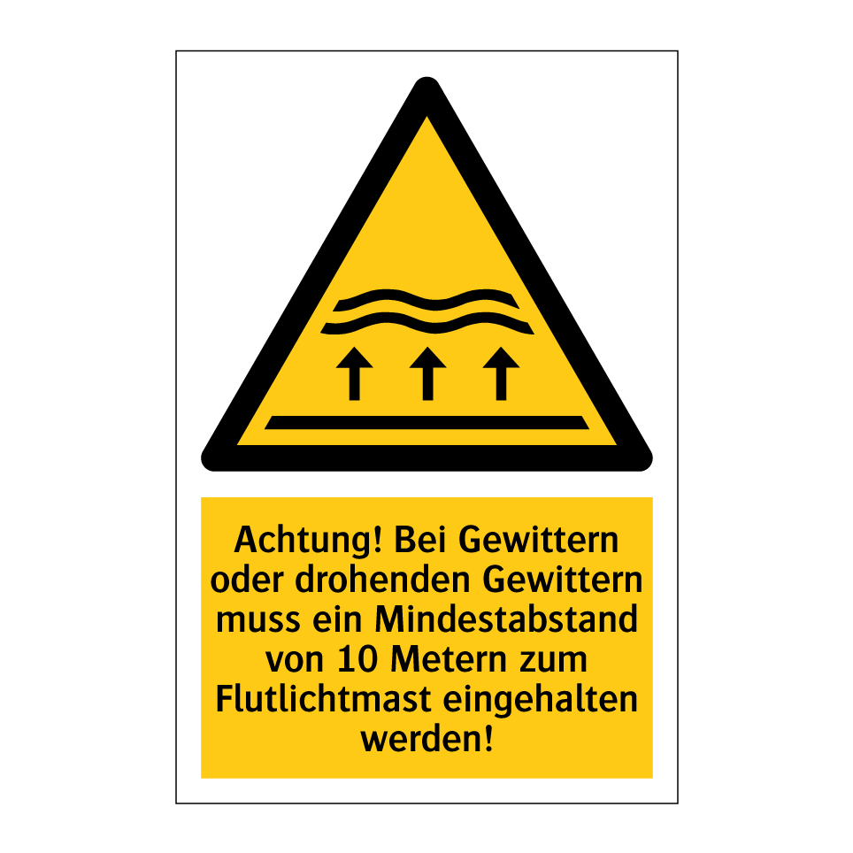 Warnschild mit dem Text Achtung! Bei Gewittern oder drohenden Gewittern muss ein Mindestabstand von 10 Metern zum Flutlichtmast eingehalten werden!