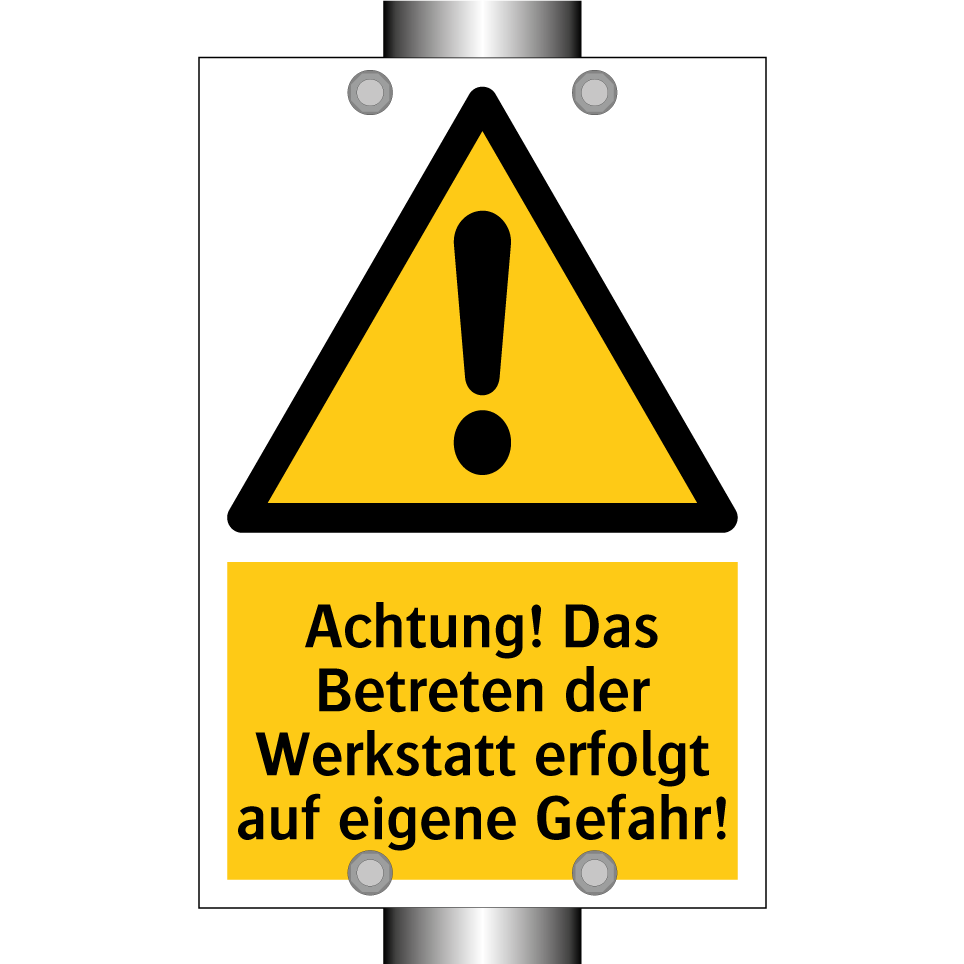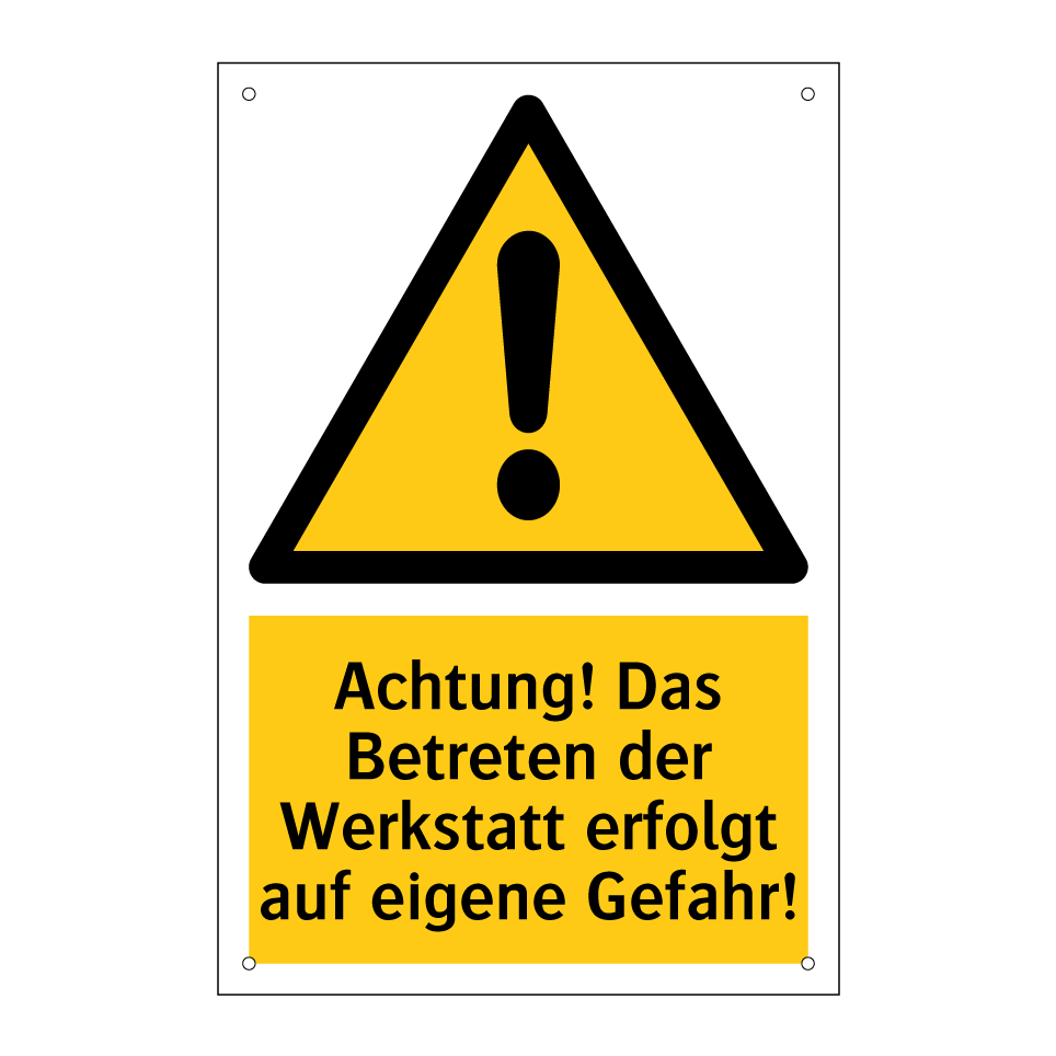 Warnschild mit dem Text Achtung! Das Betreten der Werkstatt erfolgt auf eigene Gefahr!