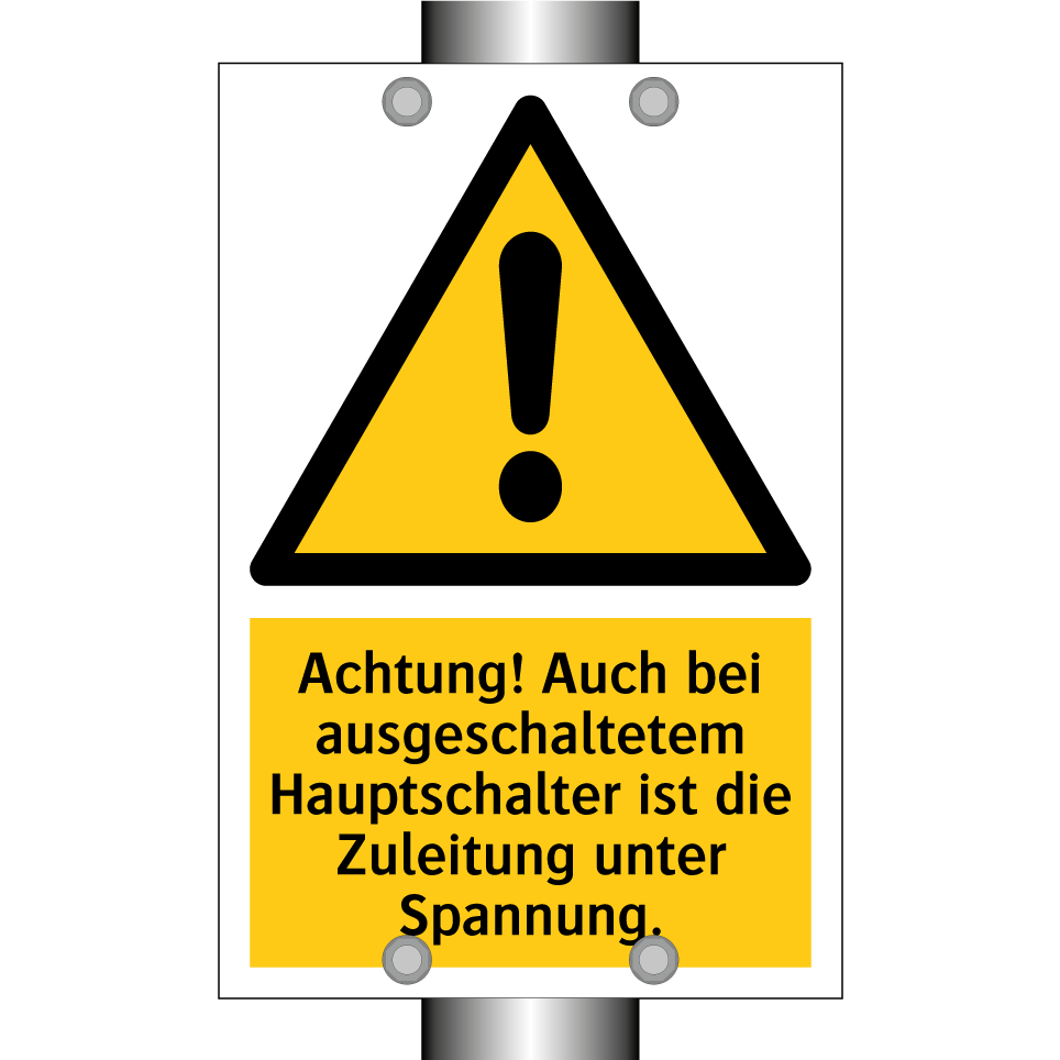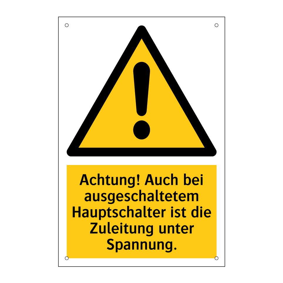 Warnschild mit dem Text Achtung! Auch bei ausgeschaltetem Hauptschalter ist die Zuleitung unter Spannung.