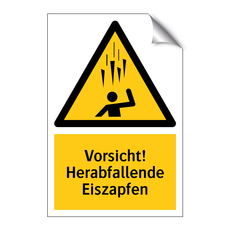 Warnschild mit dem Text Vorsicht! Herabfallende Eiszapfen