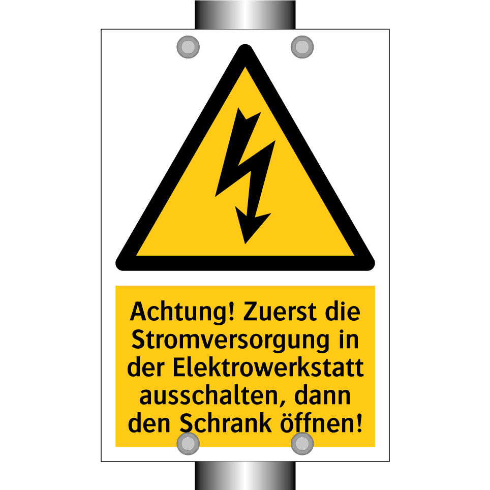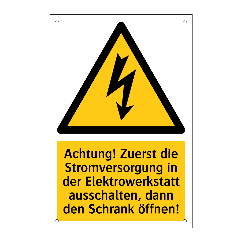 Warnschild mit dem Text Achtung! Zuerst die Stromversorgung in der Elektrowerkstatt ausschalten, dann den Schrank öffnen!