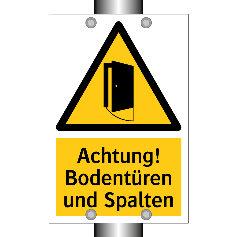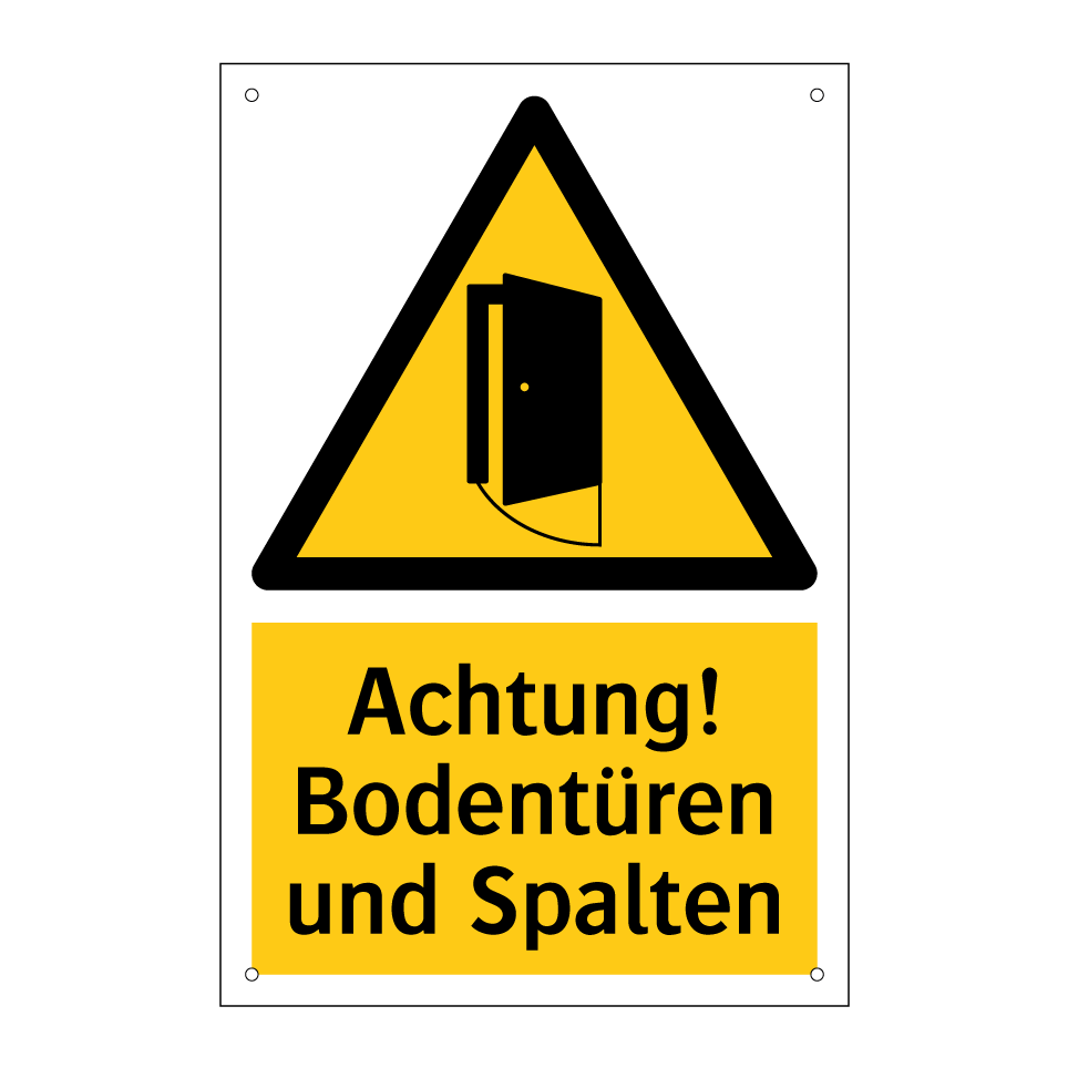 Warnschild mit dem Text Achtung! Bodentüren und Spalten
