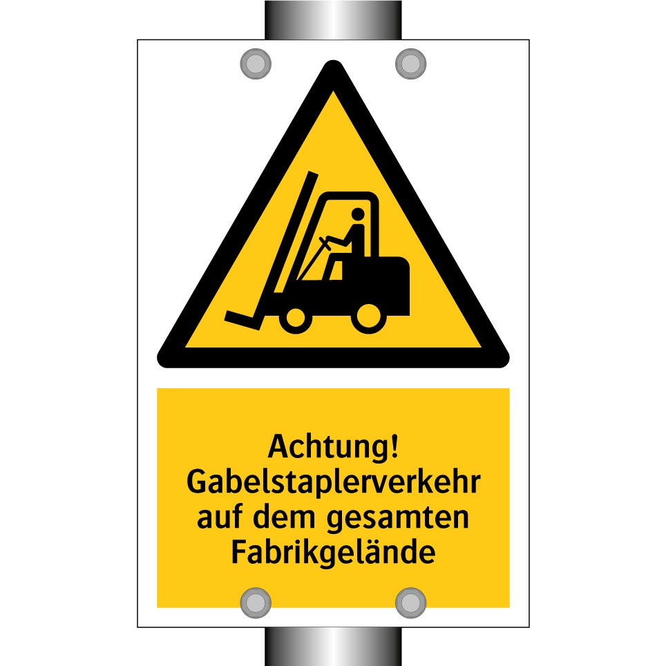 Warnschild mit dem Text Achtung! Gabelstaplerverkehr auf dem gesamten Fabrikgelände