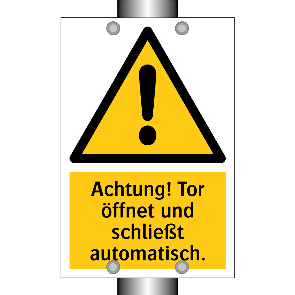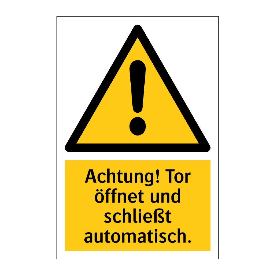 Warnschild mit dem Text Achtung! Tor öffnet und schließt automatisch.