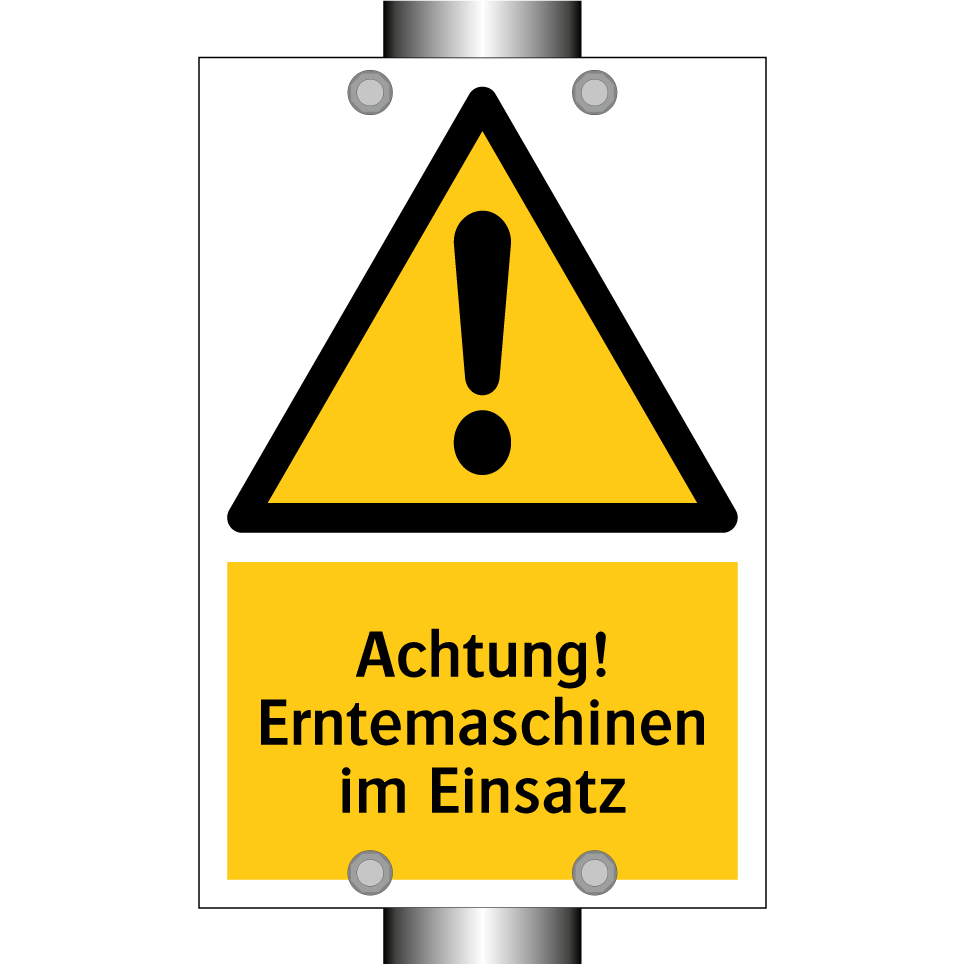 Warnschild mit dem Text Achtung! Erntemaschinen im Einsatz