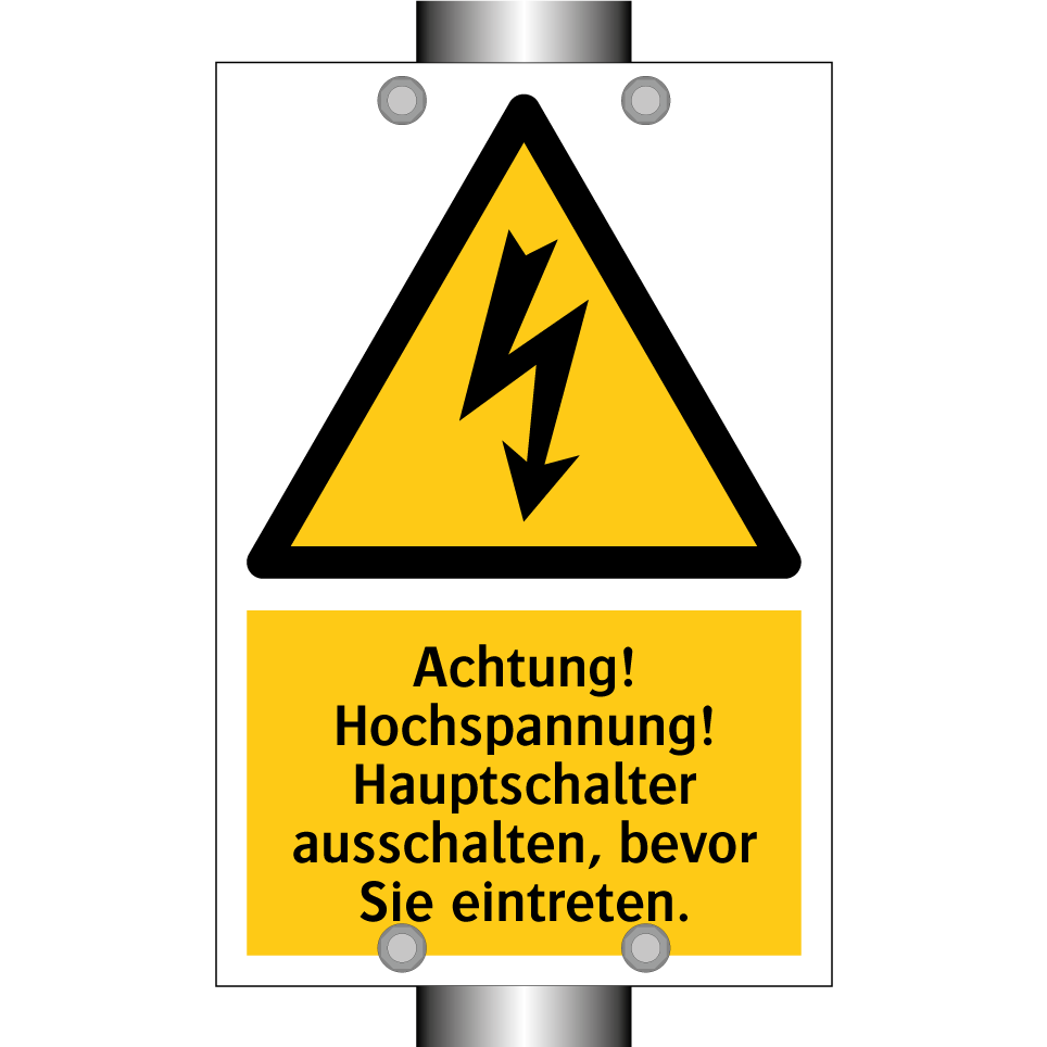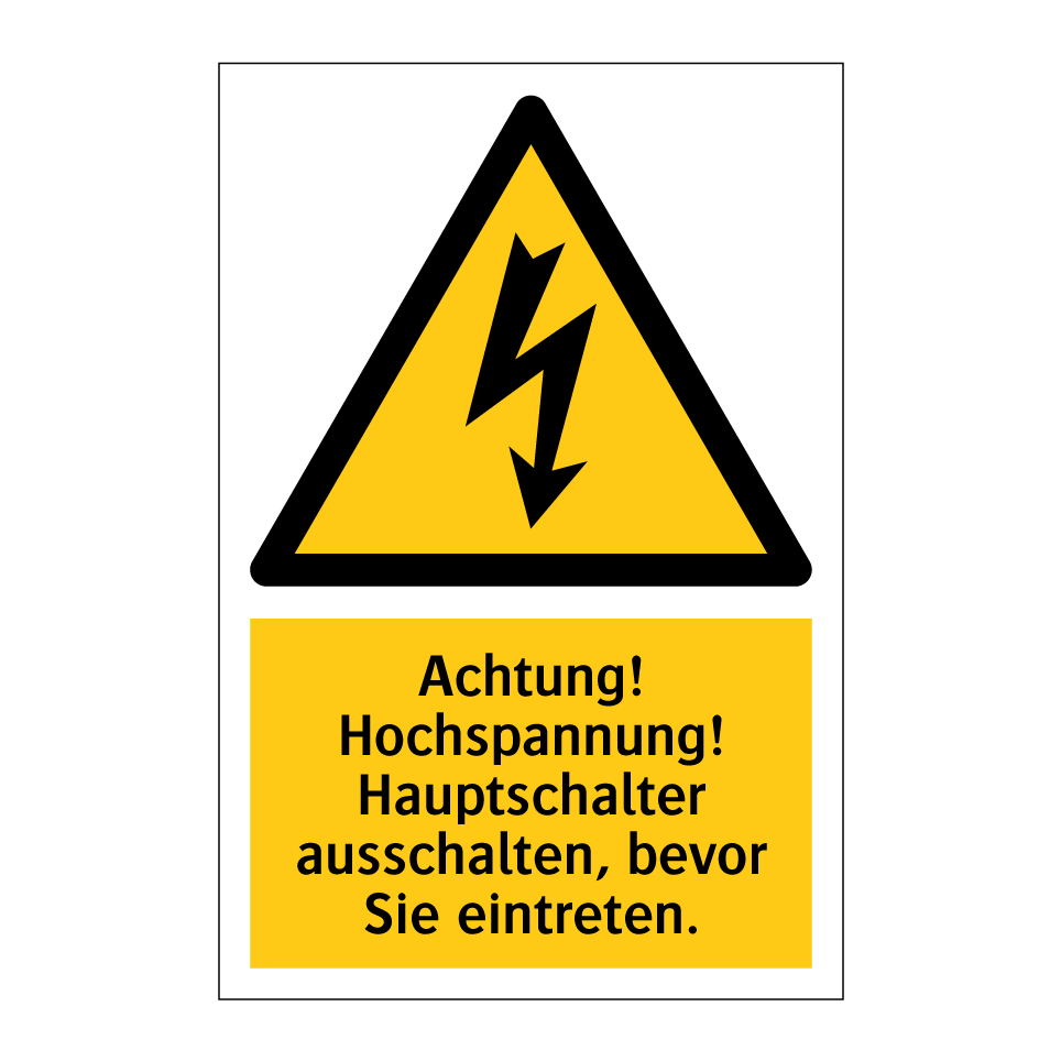 Warnschild mit dem Text Achtung! Hochspannung! Hauptschalter ausschalten, bevor Sie eintreten.