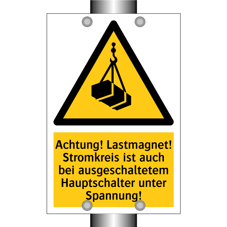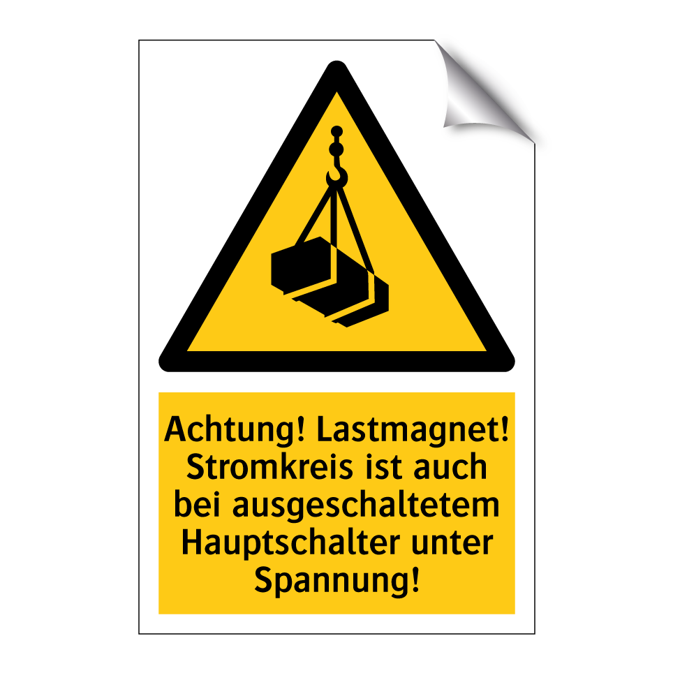 Warnschild mit dem Text Achtung! Lastmagnet! Stromkreis ist auch bei ausgeschaltetem Hauptschalter unter Spannung!