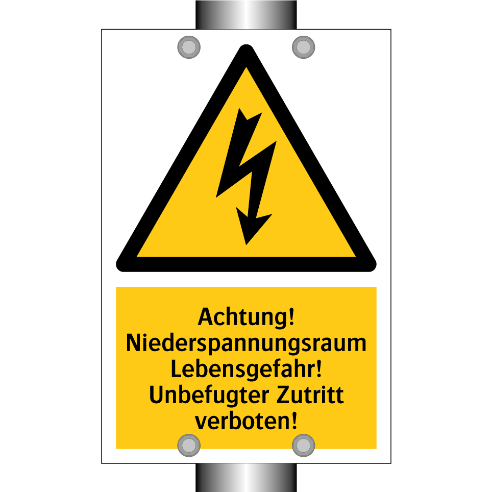 Warnschild mit dem Text Achtung! Niederspannungsraum Lebensgefahr! Unbefugter Zutritt verboten!