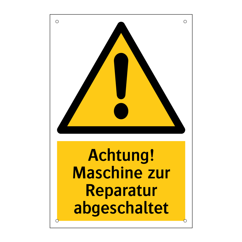 Warnschild mit dem Text Achtung! Maschine zur Reparatur abgeschaltet