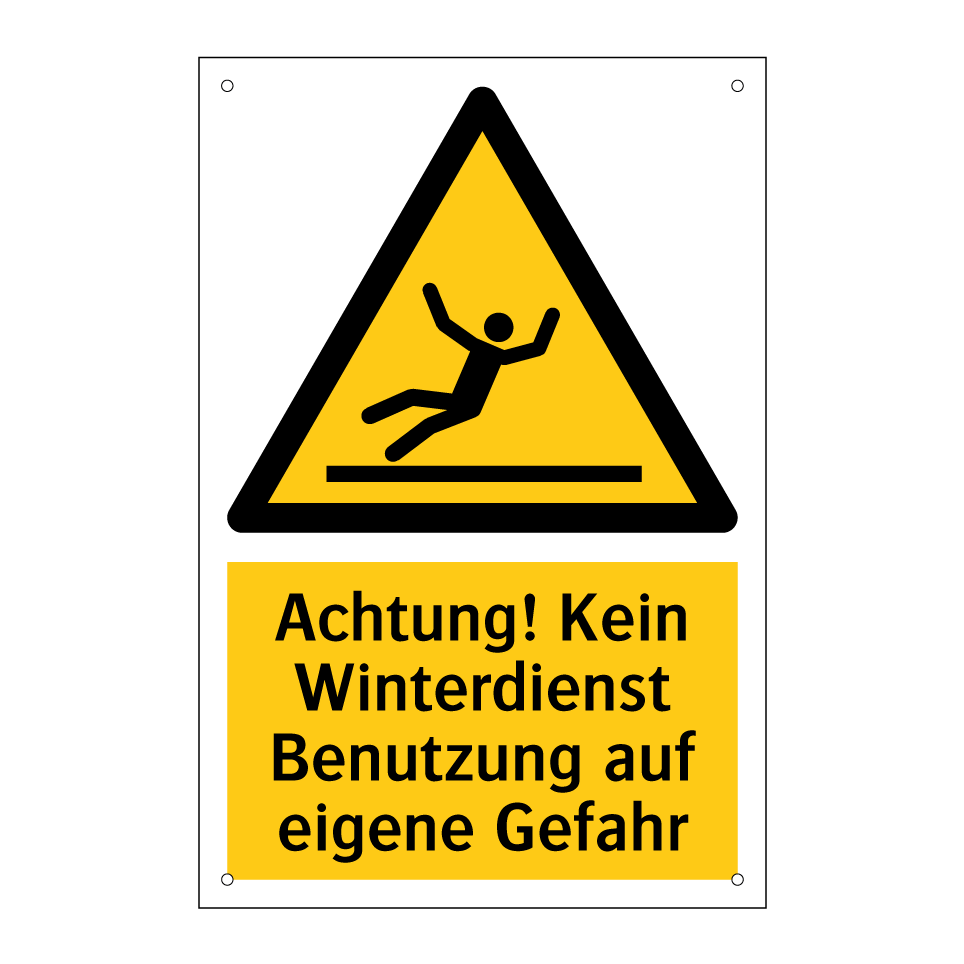 Warnschild mit dem Text Achtung! Kein Winterdienst Benutzung auf eigene Gefahr
