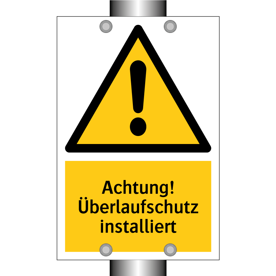 Warnschild mit dem Text Achtung! Überlaufschutz installiert