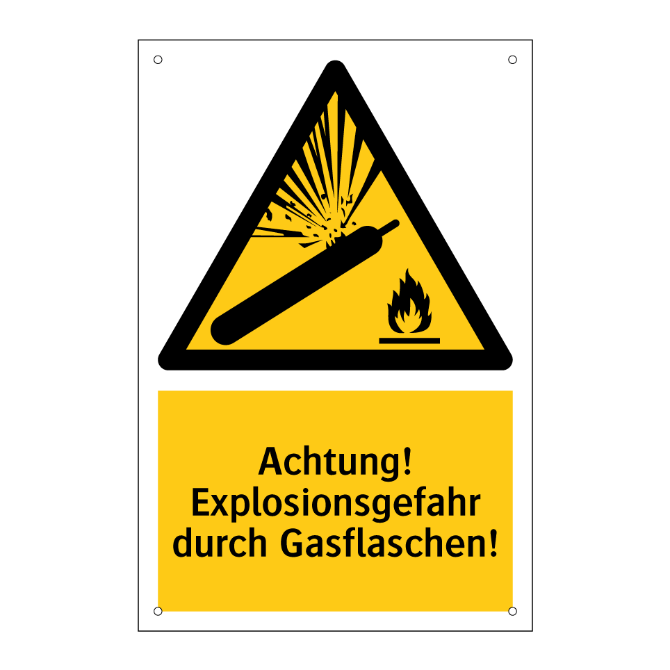 Diese Warnschild ist ein unverzichtbares Element für die Sicherheit in Bereichen, in denen Gasflaschen gelagert oder verwendet werden. Mit ihrer auffälligen gelben Hintergrundfarbe und der klaren schwarzen Schrift zieht sie sofort die Aufmerksamkeit auf sich und warnt effektiv vor der Gefahr von Explosionen. Ideal für den Einsatz in Industrieanlagen, Werkstätten oder Lagerräumen, wo Gasflaschen vorhanden sind. Diese Warnschilder können an Wänden, Türen oder in der Nähe von Lagerbereichen angebracht werden, um sicherzustellen, dass alle Personen in der Umgebung auf die potenziellen Risiken aufmerksam gemacht werden. Sorgen Sie für Sicherheit und Schutz, indem Sie diese wichtige Sicherheitsmaßnahme ergreifen.