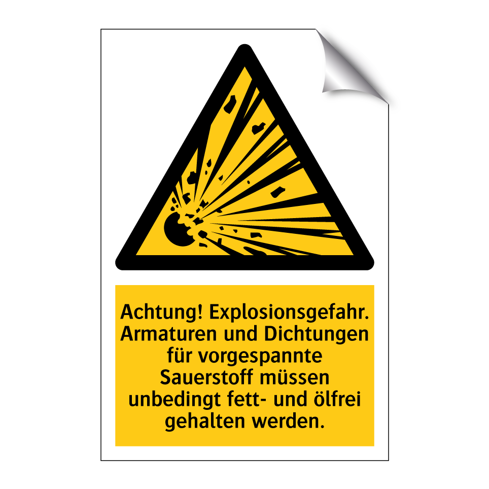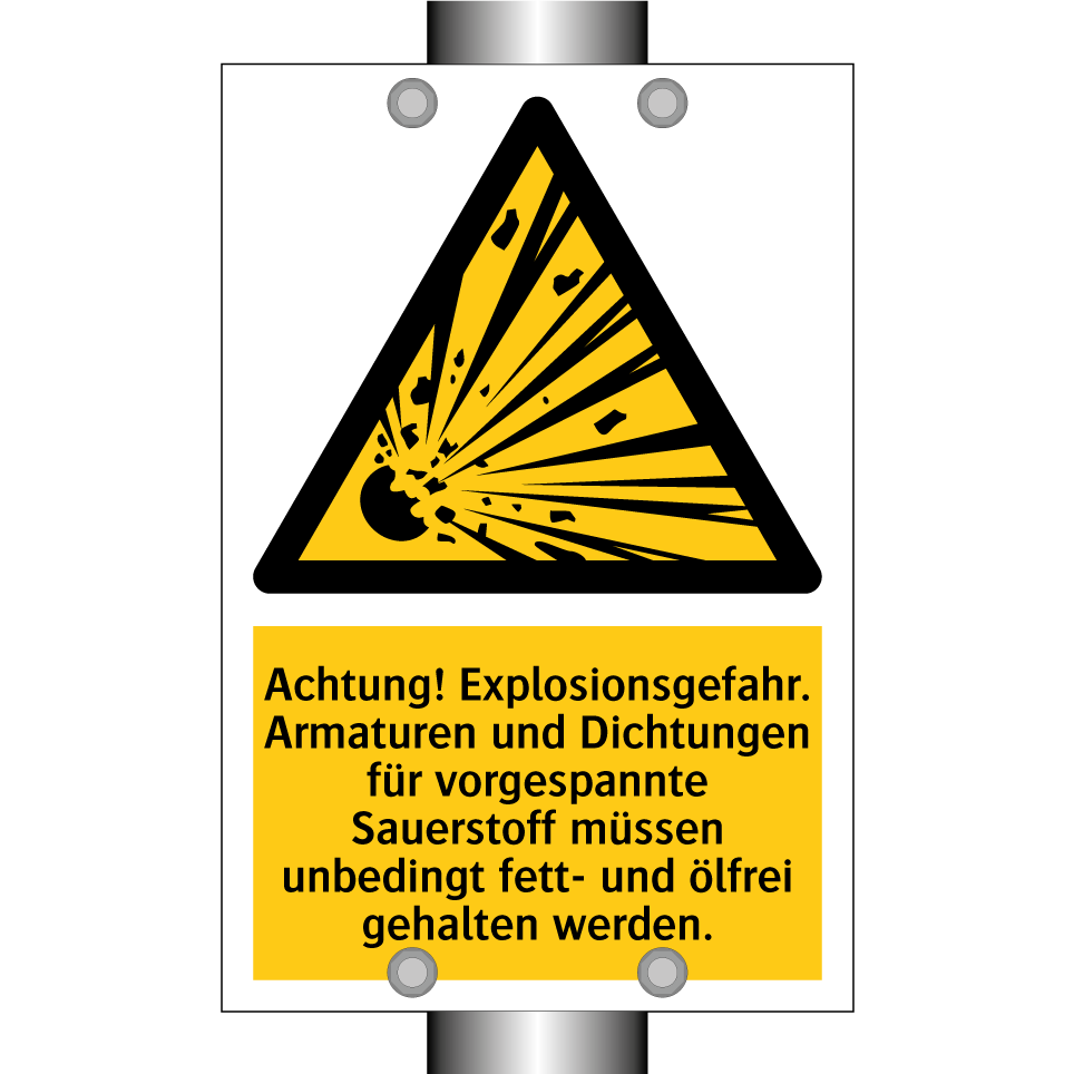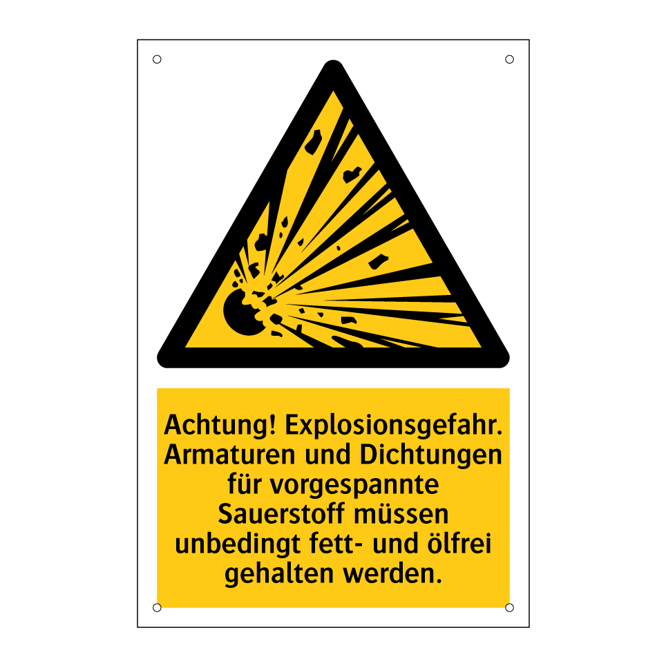 Warnschild mit dem Text Achtung! Explosionsgefahr. Armaturen und Dichtungen für vorgespannte Sauerstoff müssen unbedingt fett- und ölfrei gehalten werden.