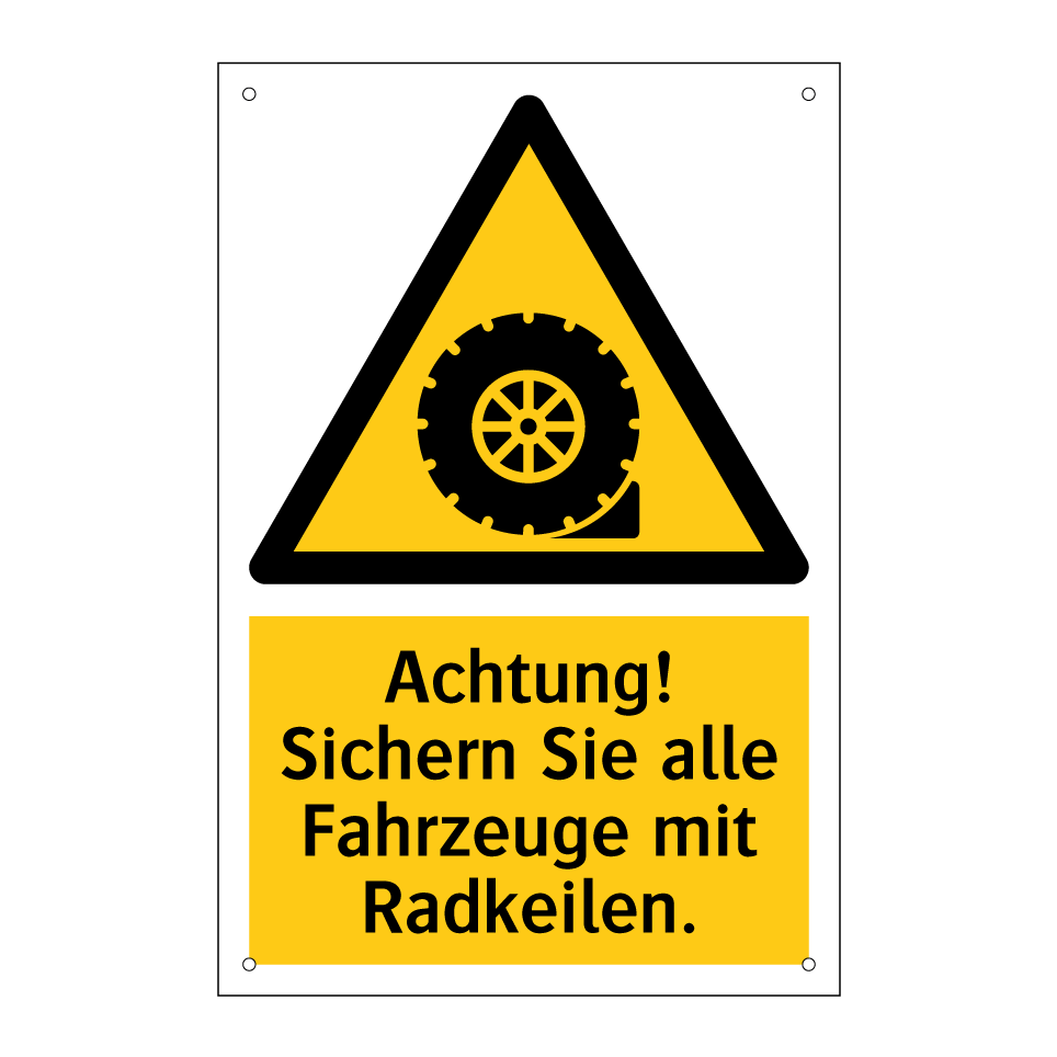 Warnschild mit dem Text Achtung! Sichern Sie alle Fahrzeuge mit Radkeilen.