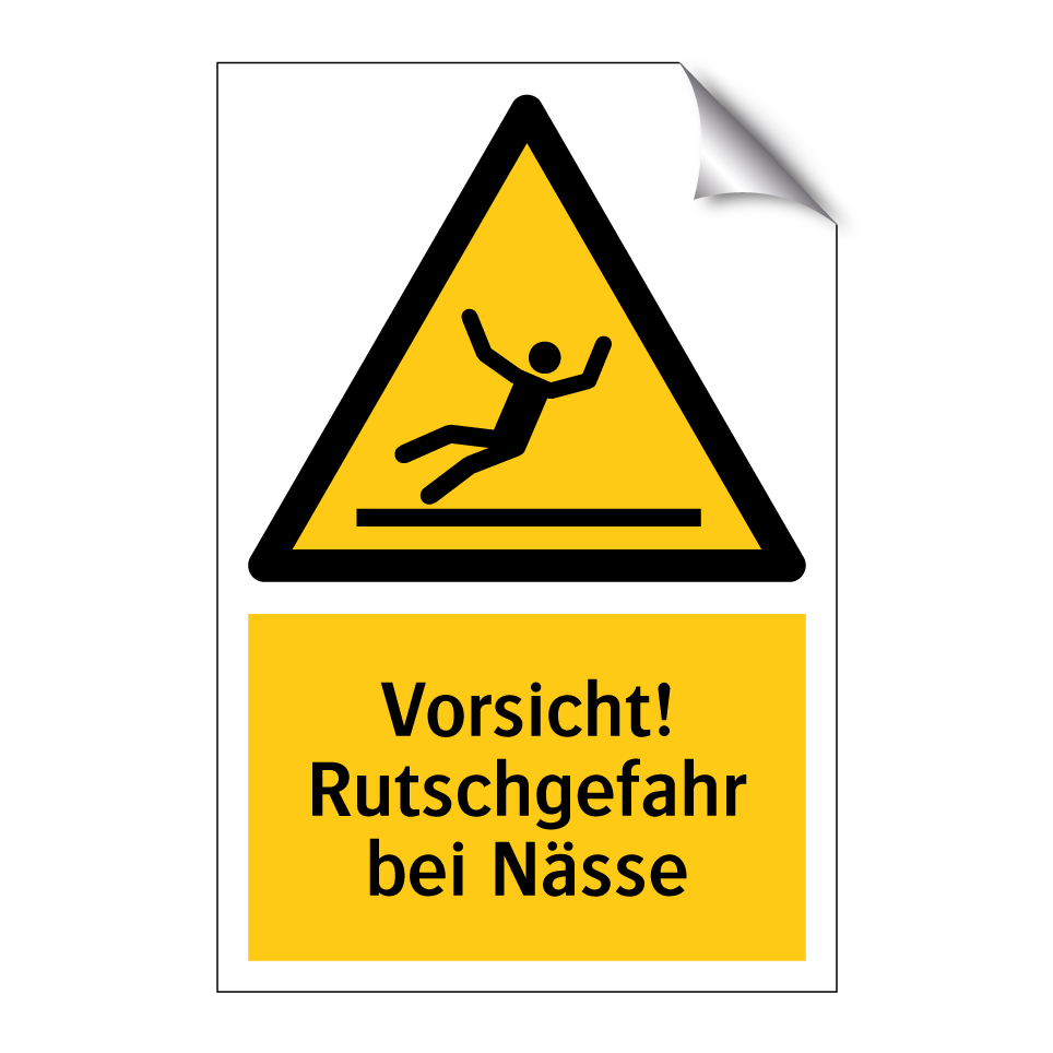 Warnschild mit dem Text Vorsicht! Rutschgefahr bei Nässe