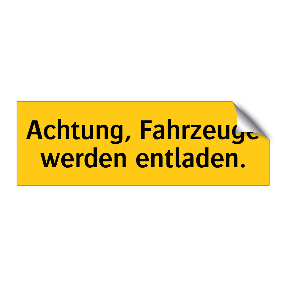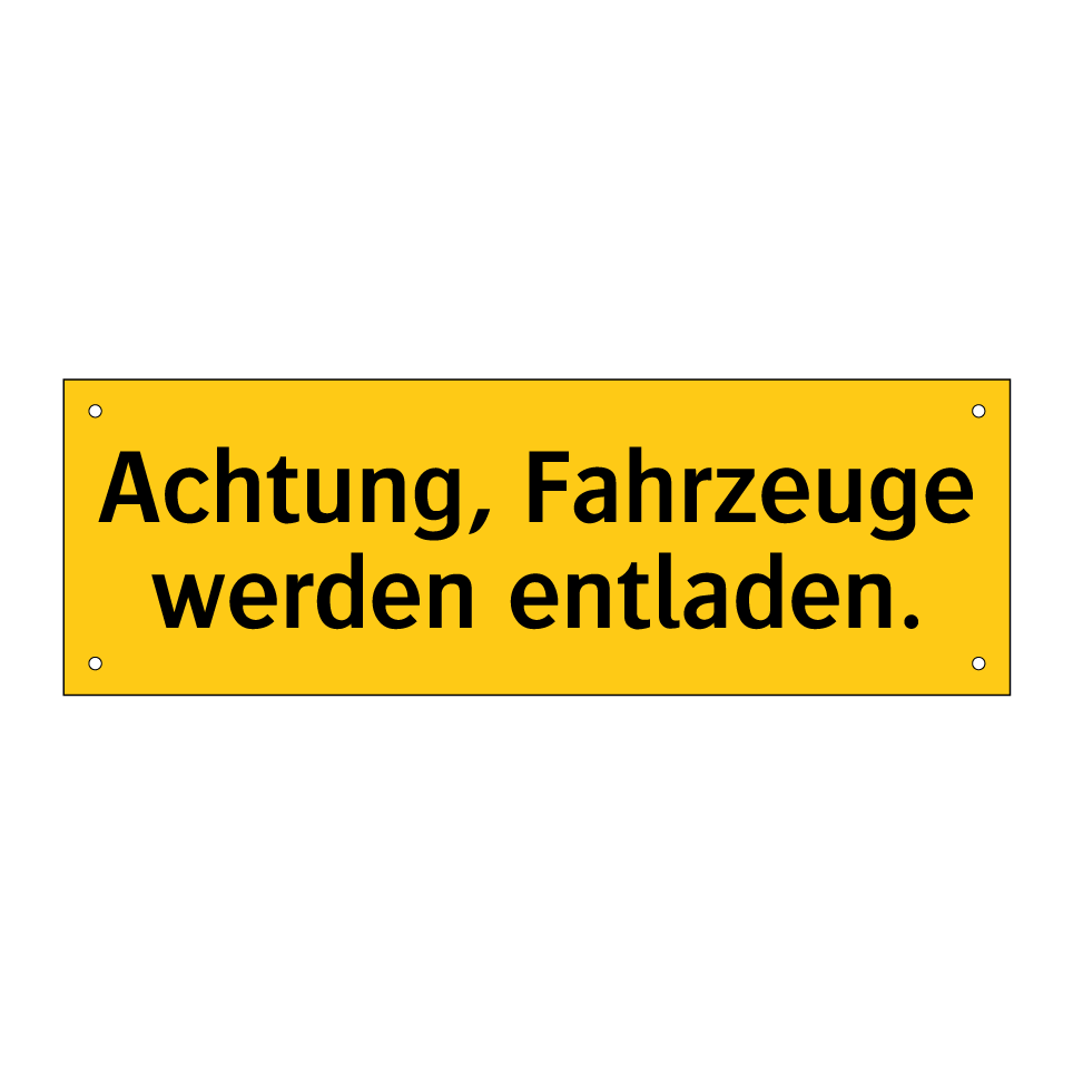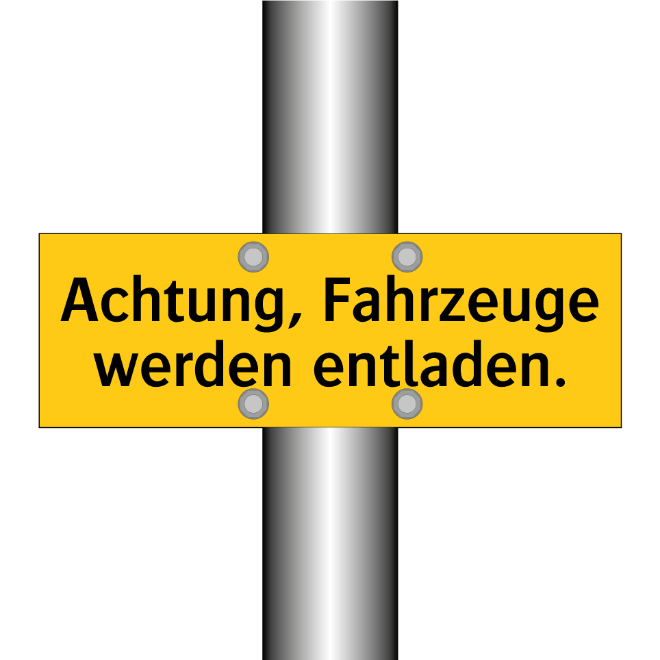 Warnschild mit dem Text Achtung, Fahrzeuge werden entladen.