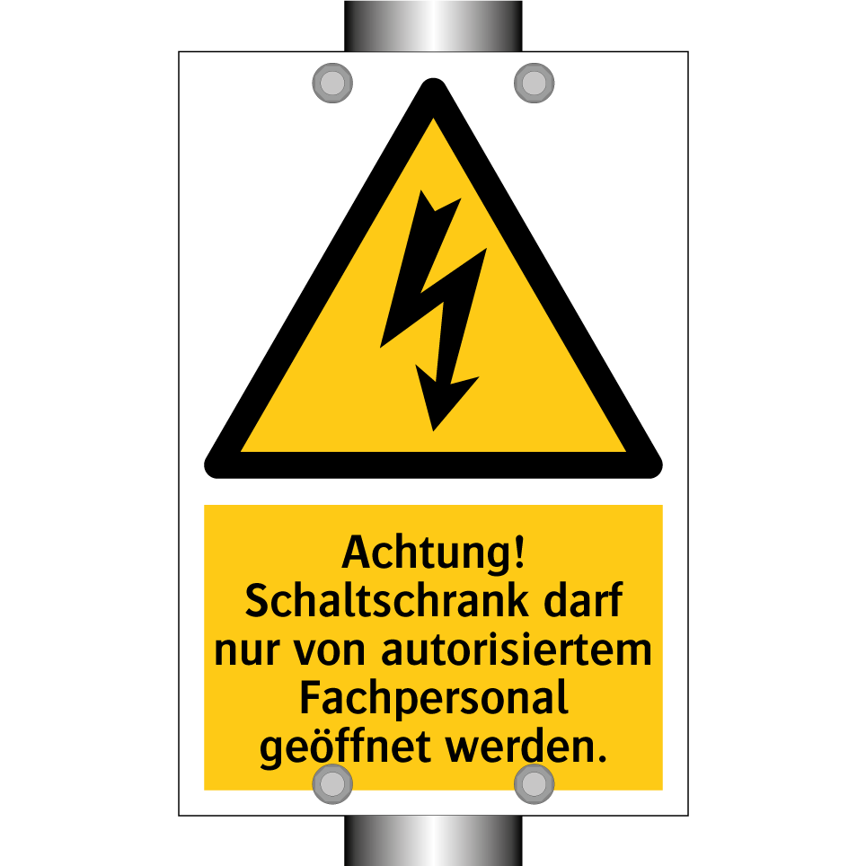 Warnschild mit dem Text Achtung! Schaltschrank darf nur von autorisiertem Fachpersonal geöffnet werden.