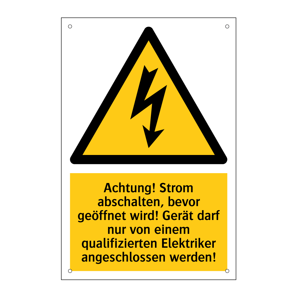 Warnschild mit dem Text Achtung! Strom abschalten, bevor geöffnet wird! Gerät darf nur von einem qualifizierten Elektriker angeschlossen werden!