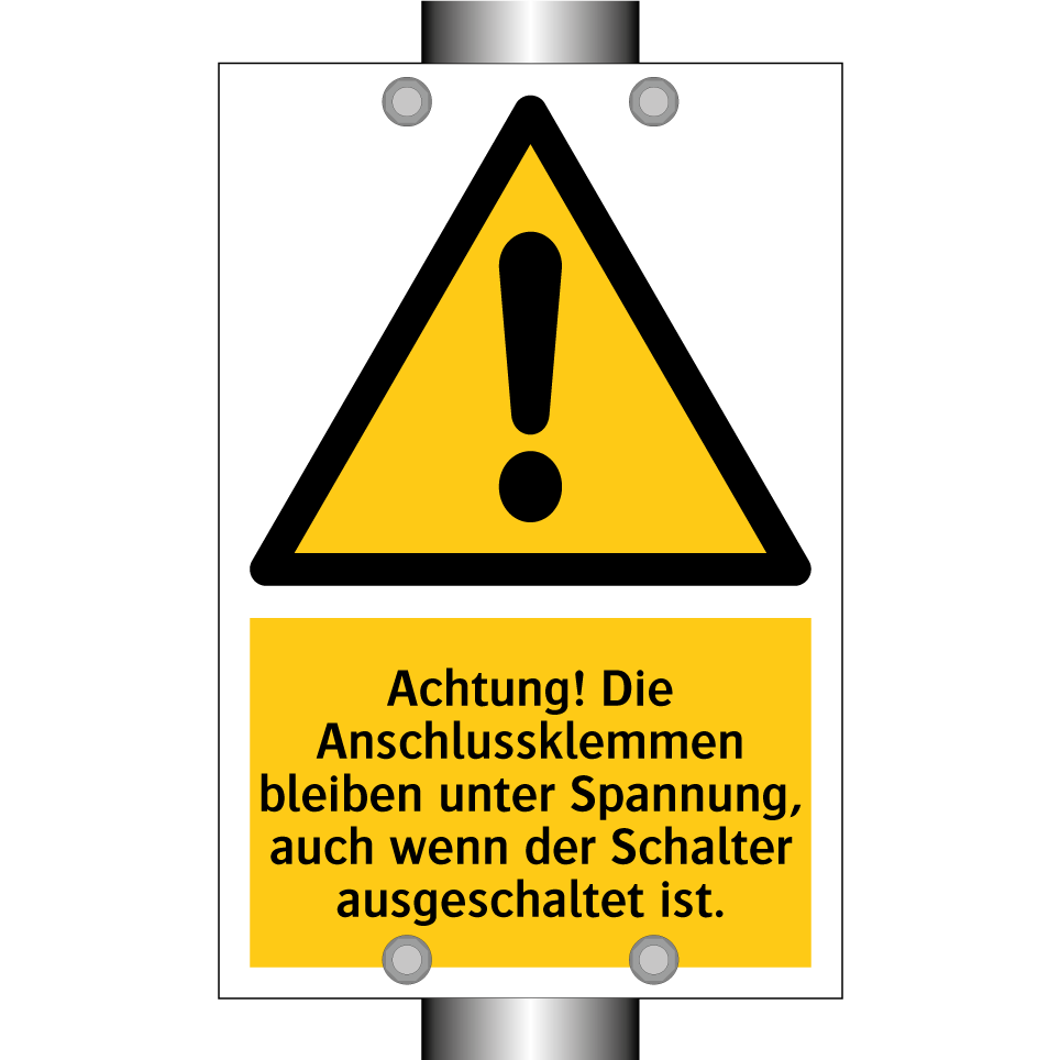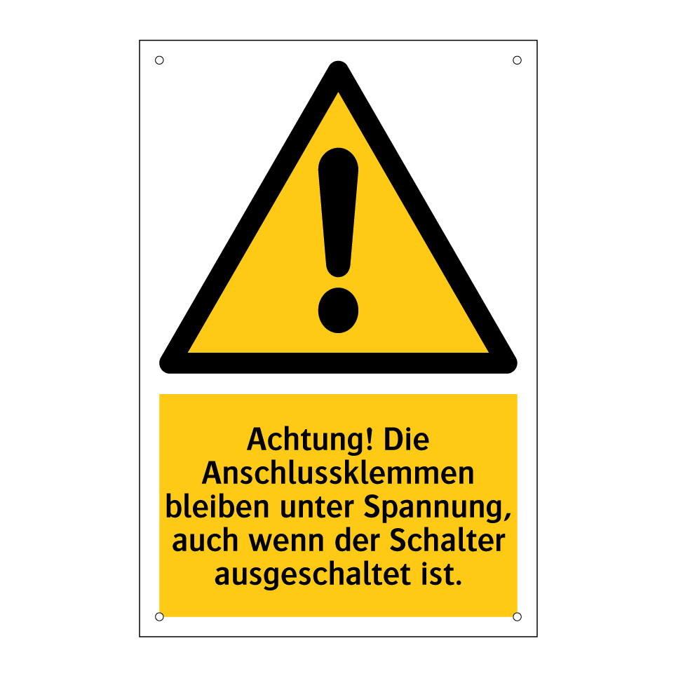 Warnschild mit dem Text Achtung! Die Anschlussklemmen bleiben unter Spannung, auch wenn der Schalter ausgeschaltet ist.