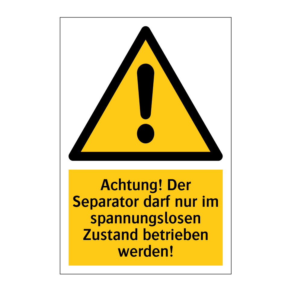 Warnschild mit dem Text Achtung! Der Separator darf nur im spannungslosen Zustand betrieben werden!