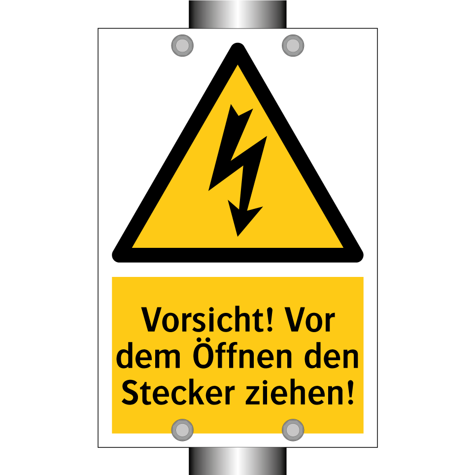 Warnschild mit dem Text Vorsicht! Vor dem Öffnen den Stecker ziehen!