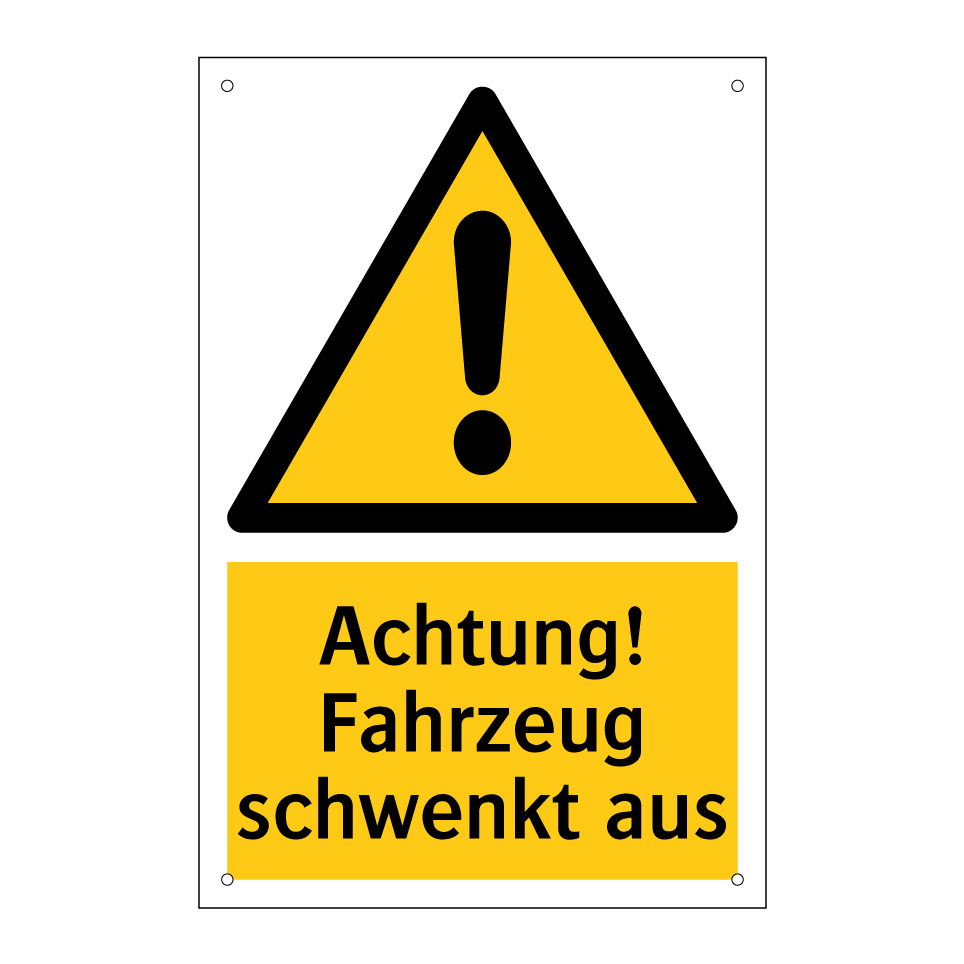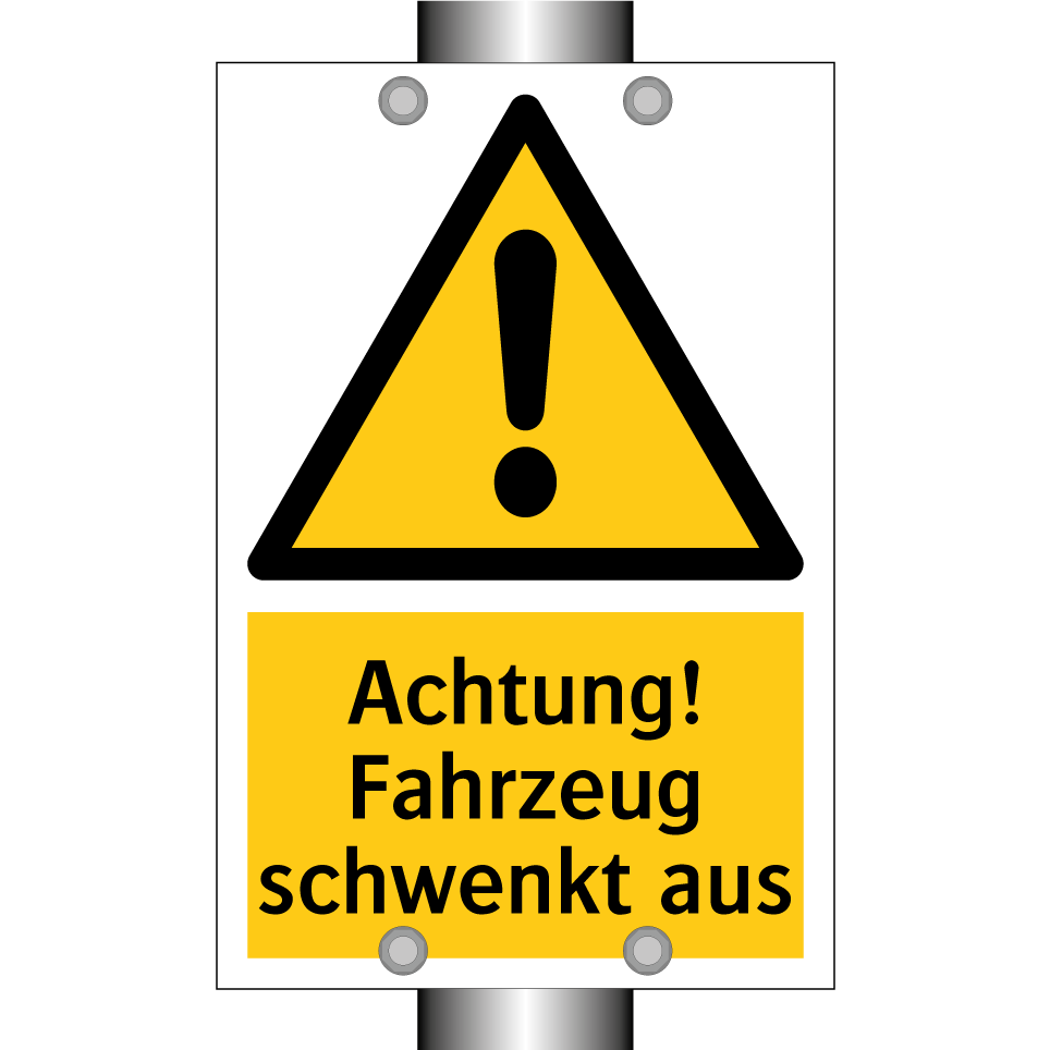 Warnschild mit dem Text Achtung! Fahrzeug schwenkt aus