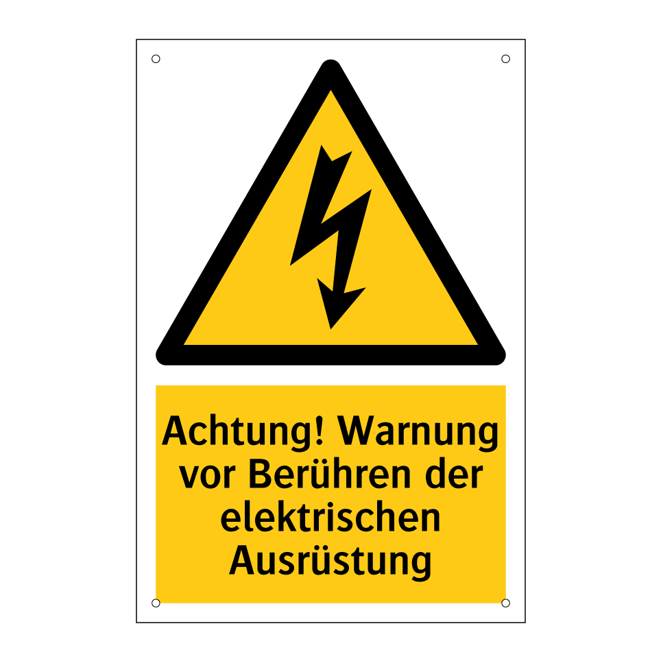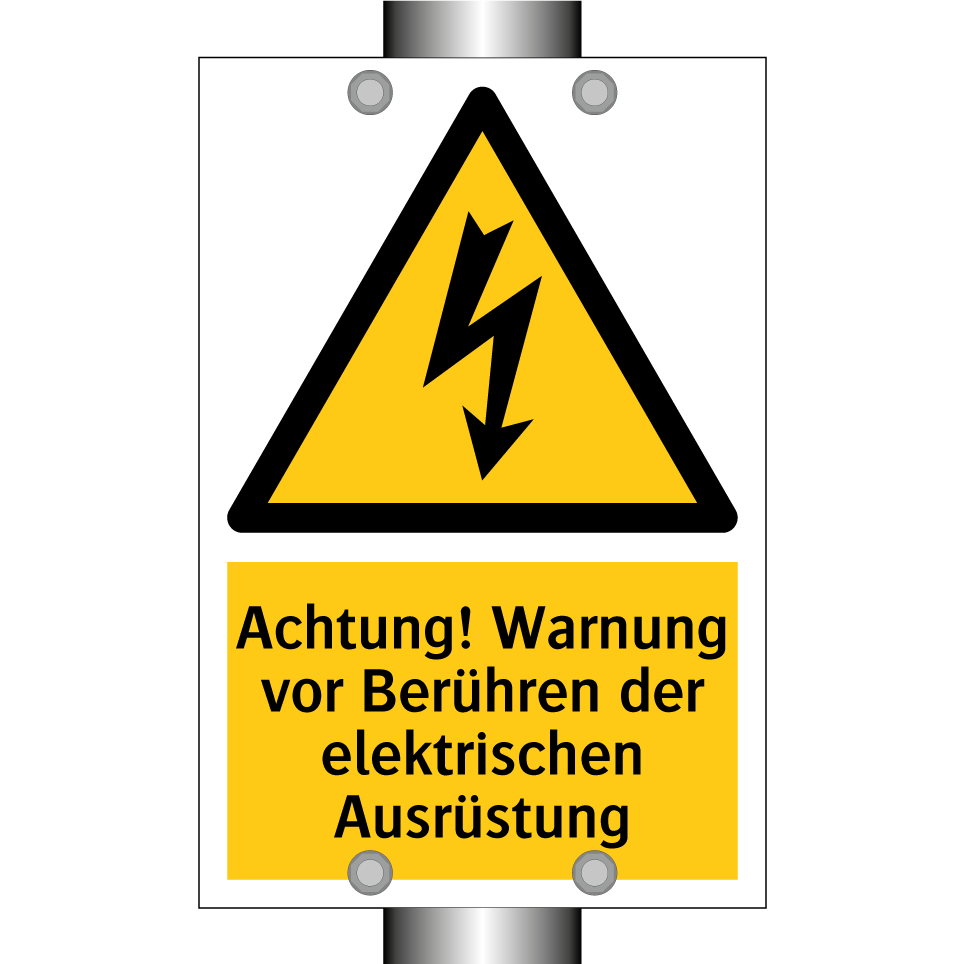 Warnschild mit dem Text Achtung! Warnung vor Berühren der elektrischen Ausrüstung