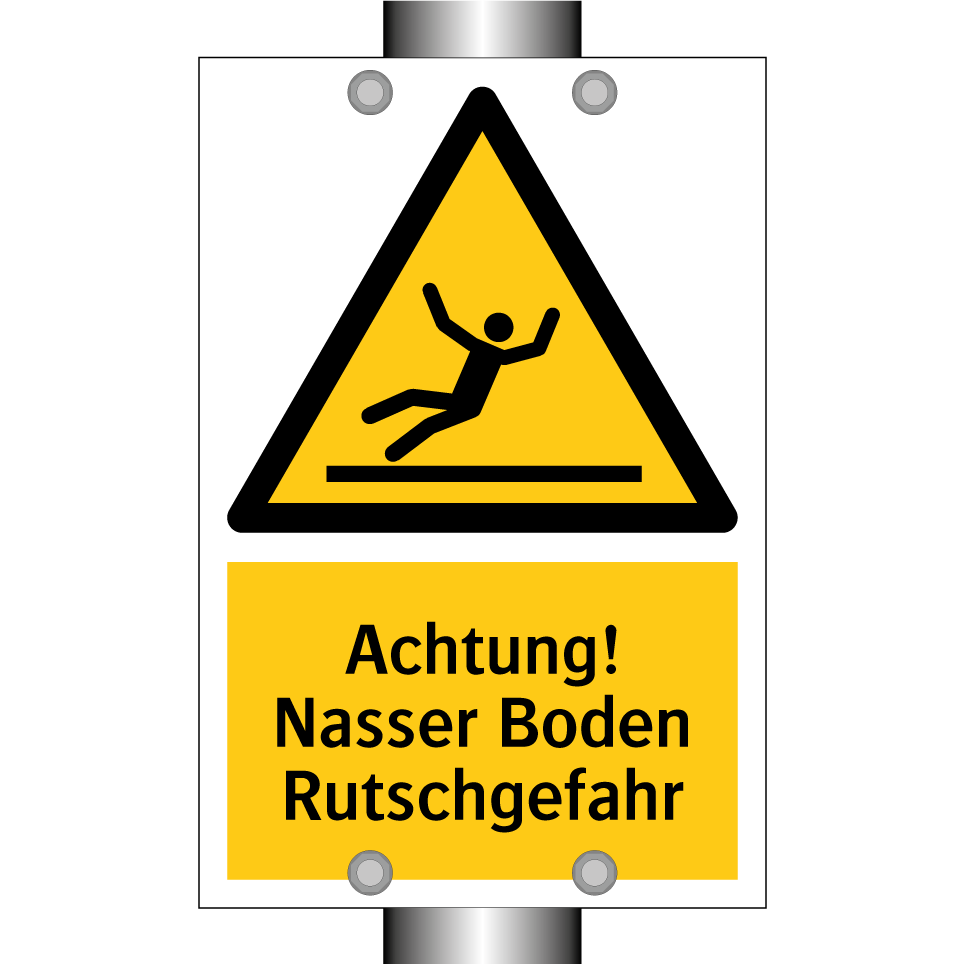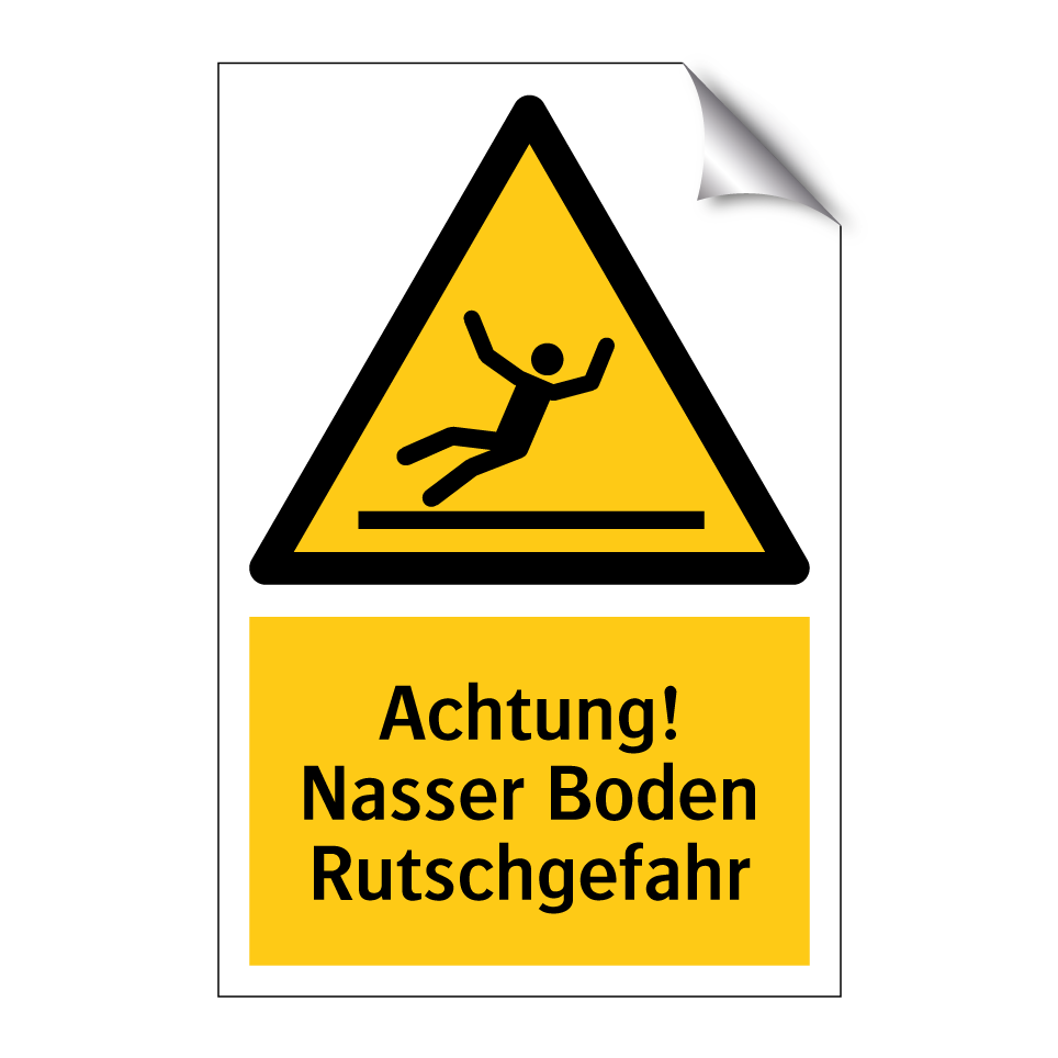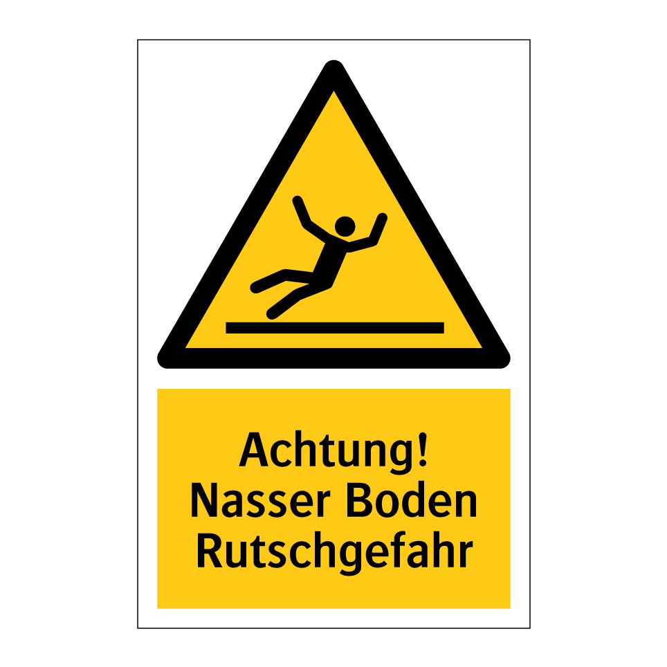 Warnschild mit dem Text Achtung! Nasser Boden Rutschgefahr