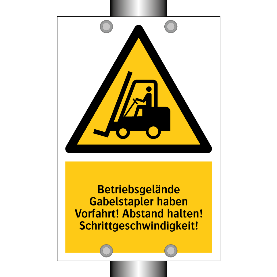 Warnschild mit dem Text Betriebsgelände Gabelstapler haben Vorfahrt! Abstand halten! Schrittgeschwindigkeit!
