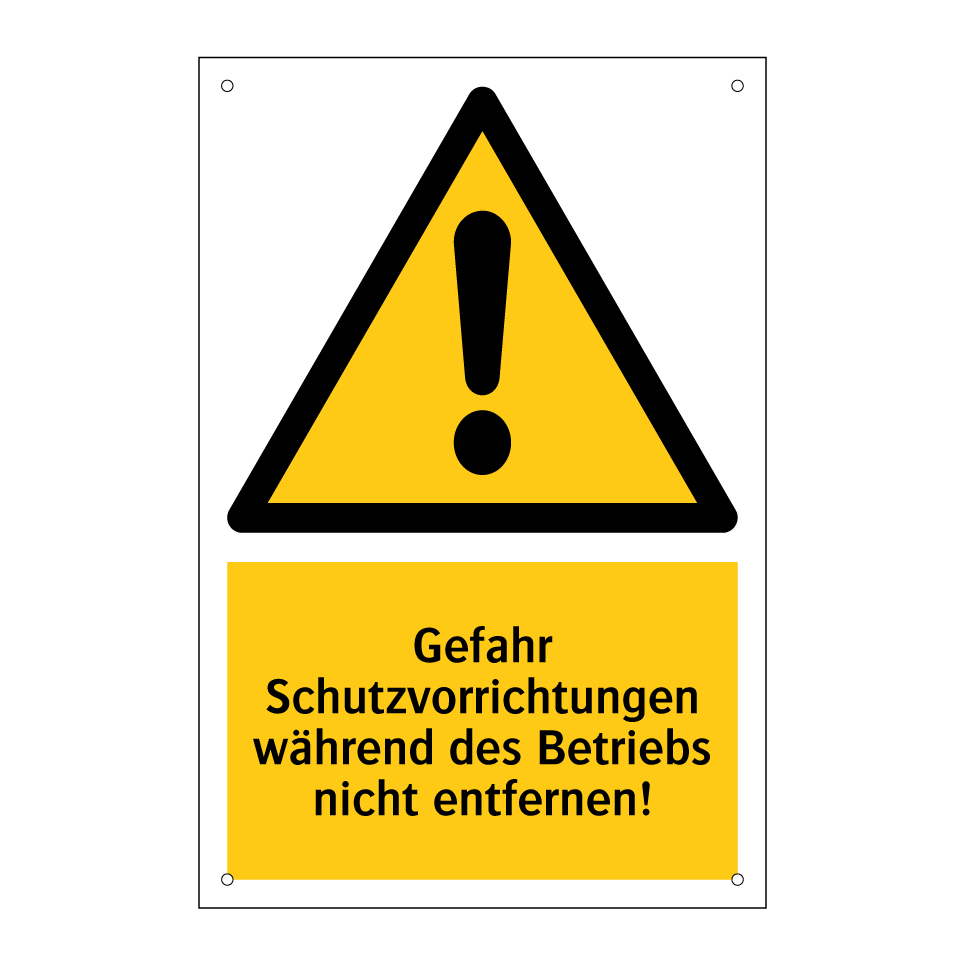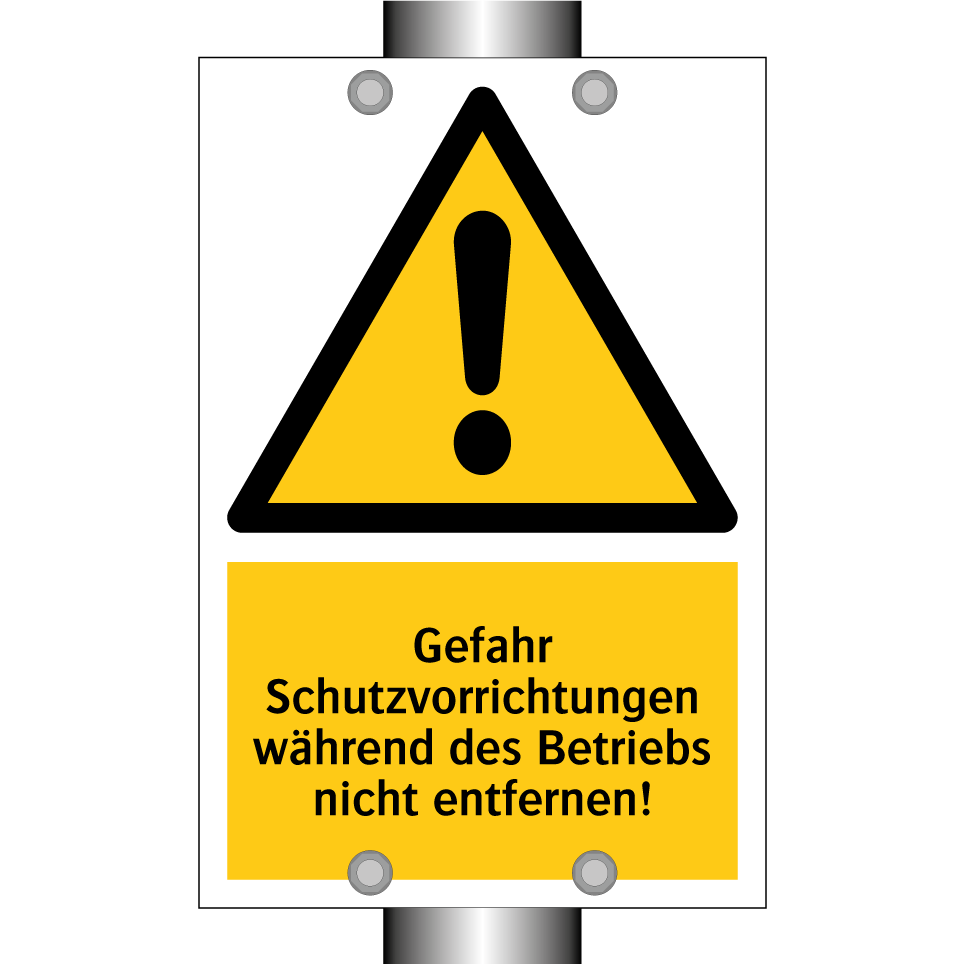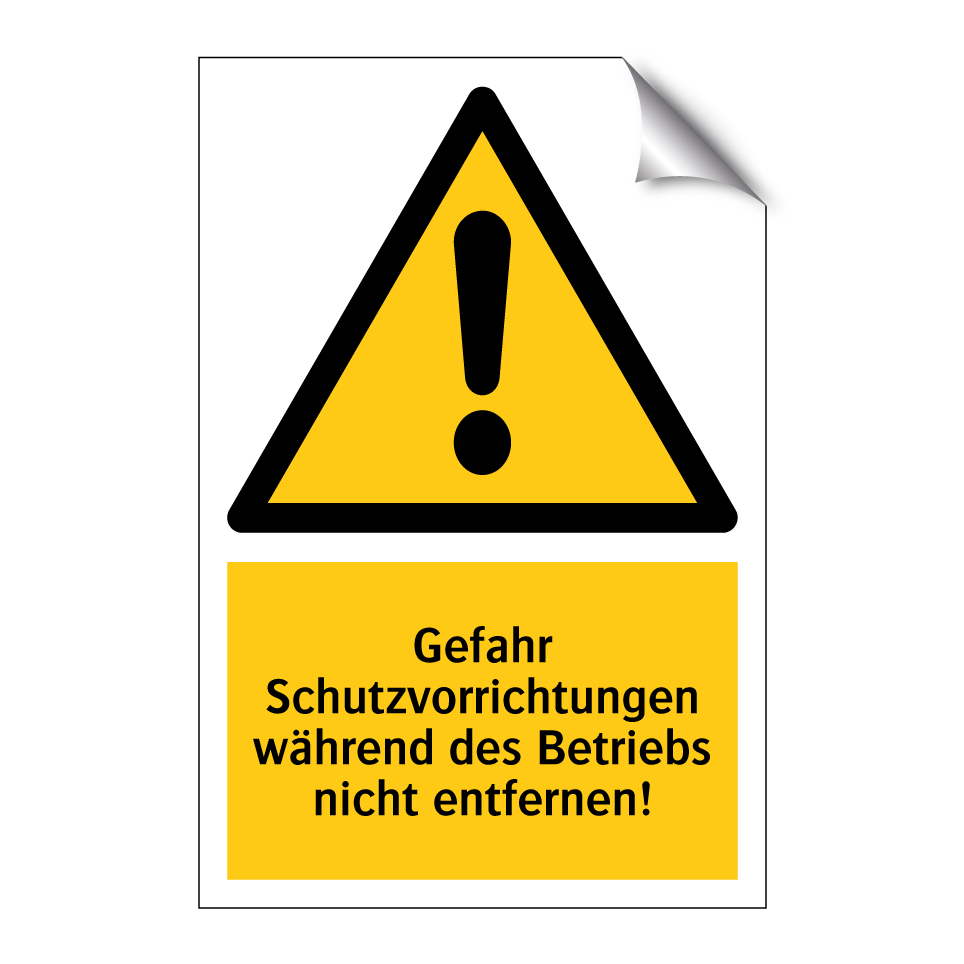 Warnschild mit dem Text Gefahr Schutzvorrichtungen während des Betriebs nicht entfernen!
